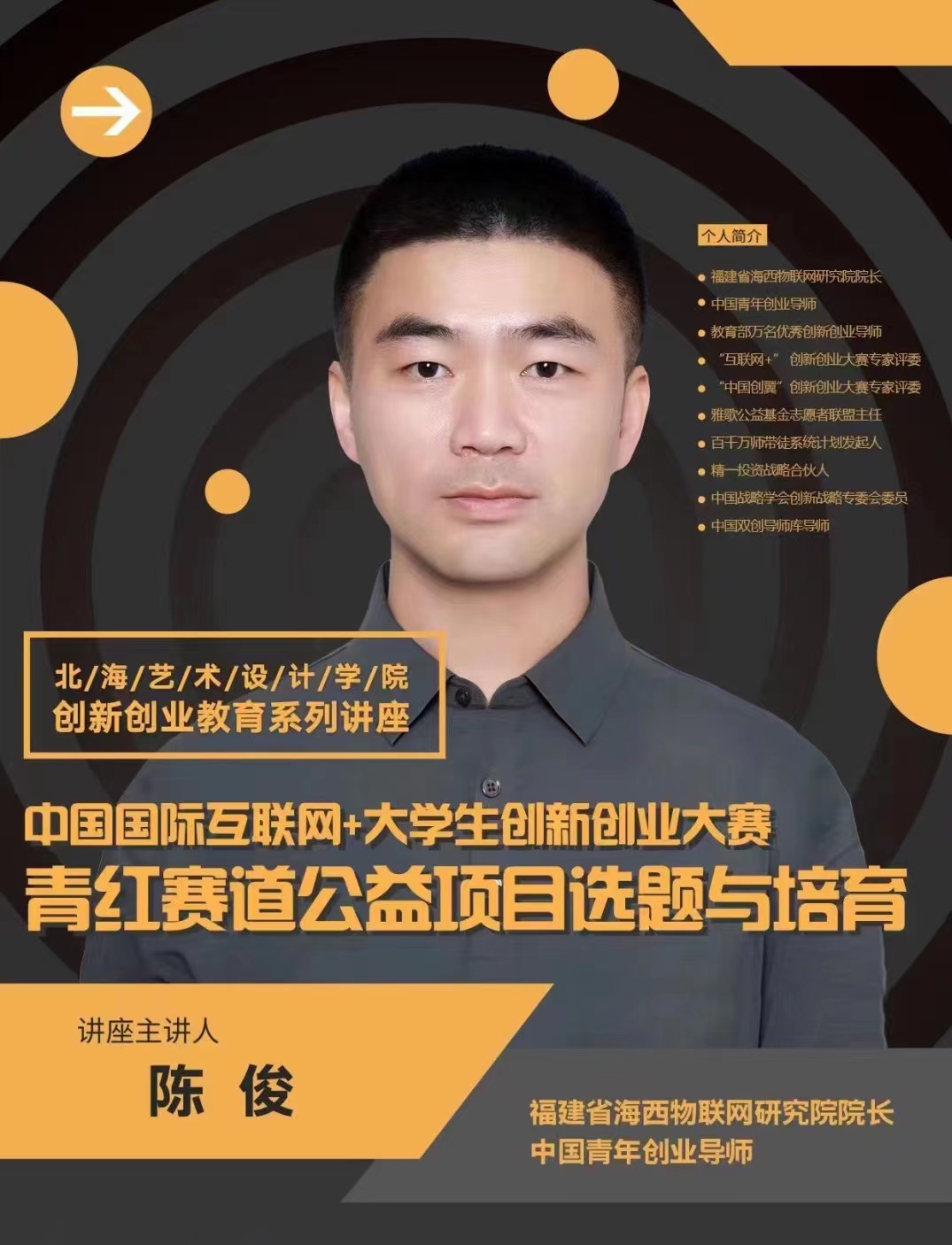 2017年陈俊老师获得了教育部首批万名优秀创新创业导师称号,目前在校内开设了“公益创业实践”必修课和“创新创业大赛”选修课,已经培养了学生近1500人,让大家知道了什么是公益,什么是青年红色筑梦之旅;并且还经常在校内外进行“创新创业”的公益巡讲,用互联网的思维去引导老师和学生们做创新创业,“1元在很多人眼里就是1元*1元,在陈俊老师的眼里1元等于100分*100分,那就是100元了,这样就可以做更多事情,这就是互联网思维。”每年这样的讲座线上线下共计百余次,受益的老师和学生近50万人。