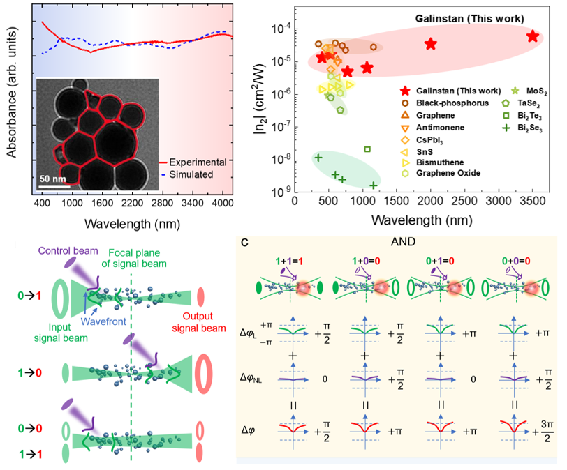 该研究设计并实现了一种多功能可重构的超宽带全光逻辑门器件。基于双光束交叉相位调制结构中的相位变化关系,提出了通过动态控制非线性折射率场,对信号光非线性相位进行可逆调控的新机制;并基于对液态金属纳米液滴超宽带等离激元效应的发现,实现了非线性折射率的巨大增强,最终在单一光学结构上集成了九种基本的布尔逻辑门功能,工作带宽可覆盖400-4000nm的可见-中红外范围。该研究为高集成、高并行度、大数据密度、高速光子芯片的实现提供了一种可行方案。
