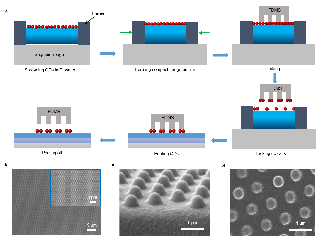 量子点发光二极管(QLED)由于其优异的光电特性,如高色纯度、高发光效率和优异的稳定性等而在照明显示领域具有广阔的应用前景。近年来,在智慧医疗、“元宇宙”等新兴概念的驱动下,下一代显示器为像素分辨率设定了更高的标准,以满足海量信息及近眼显示等不断升级的应用需求。然而,目前主流的LED显示分辨率仍停留在百微米级,进入到亚微米级之后便面临许多严峻的挑战,如何实现QLED发光层的高分辨率图案化仍然是一个关键瓶颈。