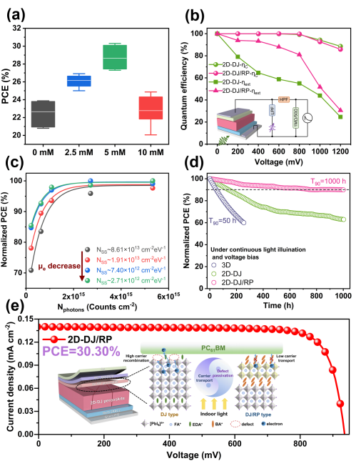 图1.(a)1000 lux下不同浓度BAI修饰的器件效率统计图;(b)基于2D-DJ和2D-DJ/RP器件的电荷收集效率和提取效率;(c)不同界面缺陷条件下归一化效率与光子数的关系;(d)钙钛矿器件在稳态光照下的运行稳定性跟踪;(e)2D-DJ/RP钙钛矿异质结的界面缺陷钝化与载流子输运过程的关系示意图及1000 lux光照下的冠军J-V曲线。