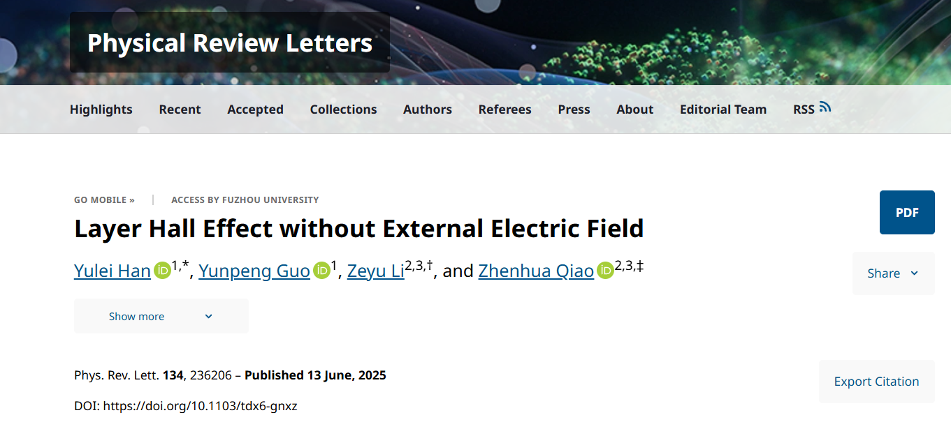 物理系韩玉磊副教授与中国科学技术大学乔振华教授合作,在层霍尔效应研究中取得重要理论进展:提出了一种无需外加电场即可实现层霍尔效应的新机制,并论证了该效应在基于拓扑绝缘体薄膜的反铁磁异质结中具有普适性,这一发现显著拓展了层霍尔效应的实现范围。该研究结果于2025年6月13日发表在国际权威期刊《物理评论快报》上[Physical Review Letters134,236206(2025)]。