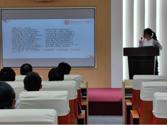 随后,学院学生会体育部部长李梓言同学介绍了物信学院近三年校运会的成绩和风采,通过数据图表详细展示了物信学院近年在校运会各个单项比赛中的成绩,激发了在场运动员的热情和斗志,振奋运动员们在比赛中取得好成绩的信心。