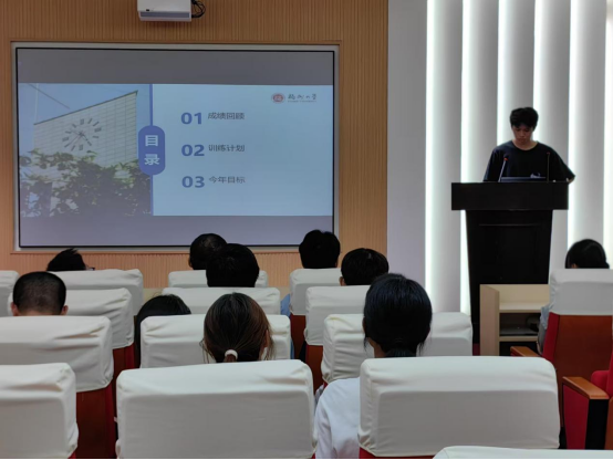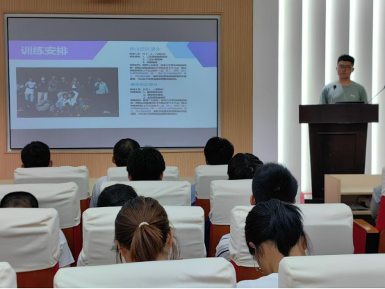 紧接着,学院田径队各队队长上台介绍不同项目的训练周期、训练计划以及预期效果。通过队长们细致的介绍,帮助队员们进一步明确训练计划与安排,以饱满的精神状态投身校运会的日常训练中。