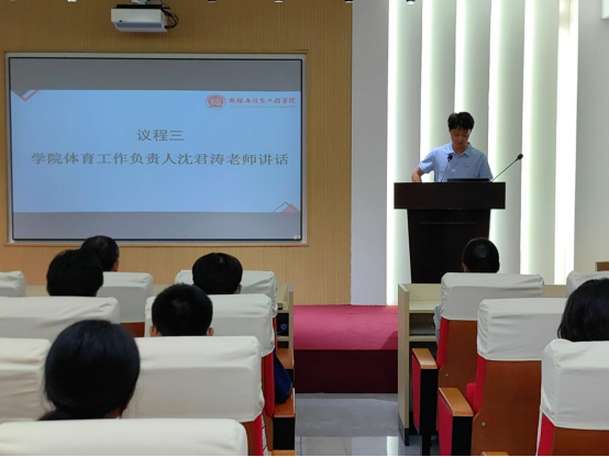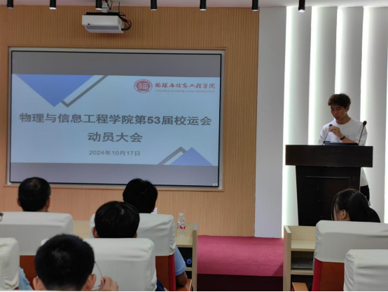在物信南楼思源厅举行第53届田径运动会动员大会。物信学院党委郑志刚副书记、2023级辅导员刘涛老师、2024级辅导员沈君涛老师出席本次大会,学院田径队全体队员以及学院体育部全体成员也参加了本次大会。