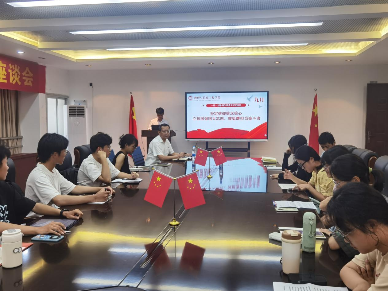 2024年9月26日下午,物信学院于铜盘校区教学楼A栋会议室开展“一月一‘习’话”——师生理论学习交流会。此次九月份的理论学习主题为:坚定信仰信念信心,立报国强国大志向、做挺膺担当奋斗者。Av在线看