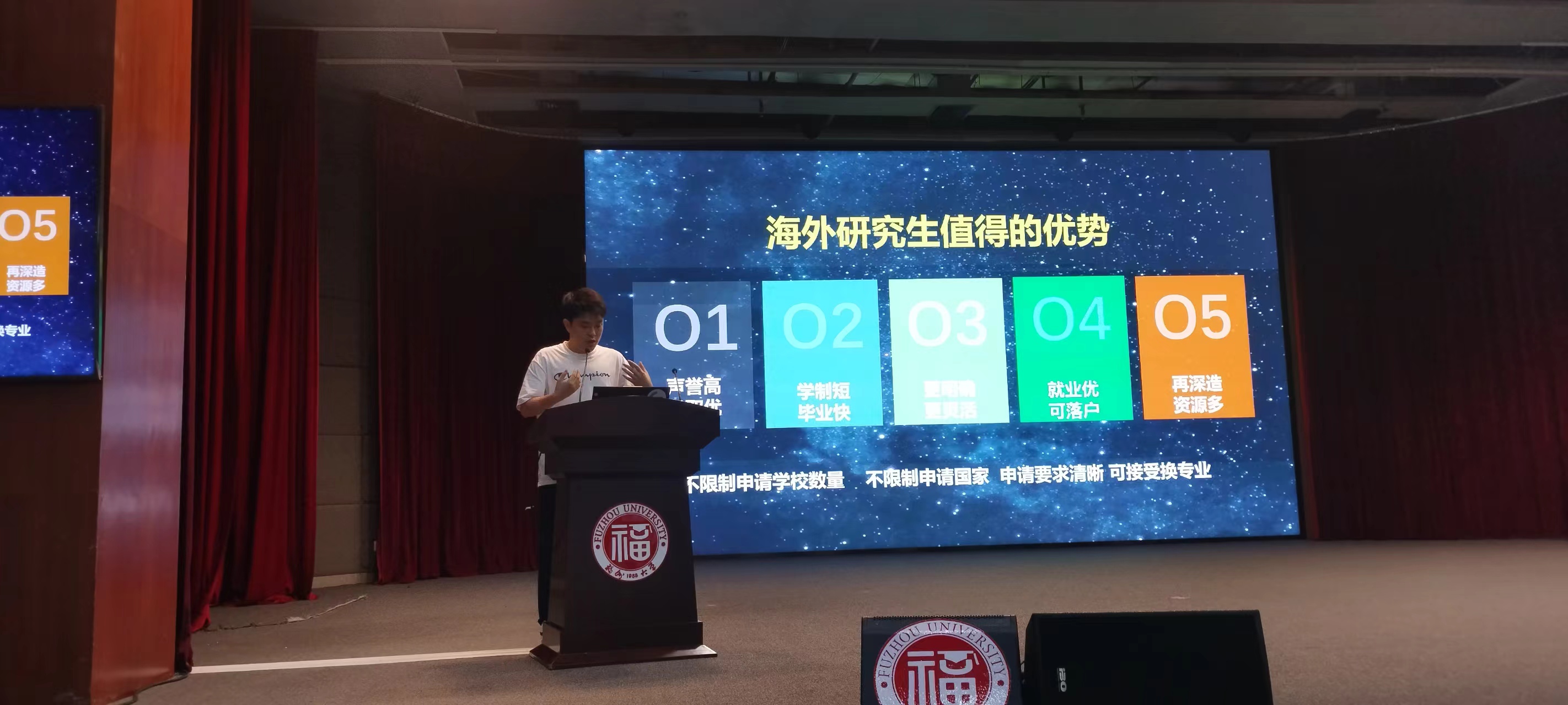 分享会上,江绍楚老师从为什么留学、福大物信学院申研优势、考研留学双保险,以及留学申请成功案例四个方面深入浅出的分享了出国出境留学的申请经验、申请方法、申请要求以及关键的时间节点。