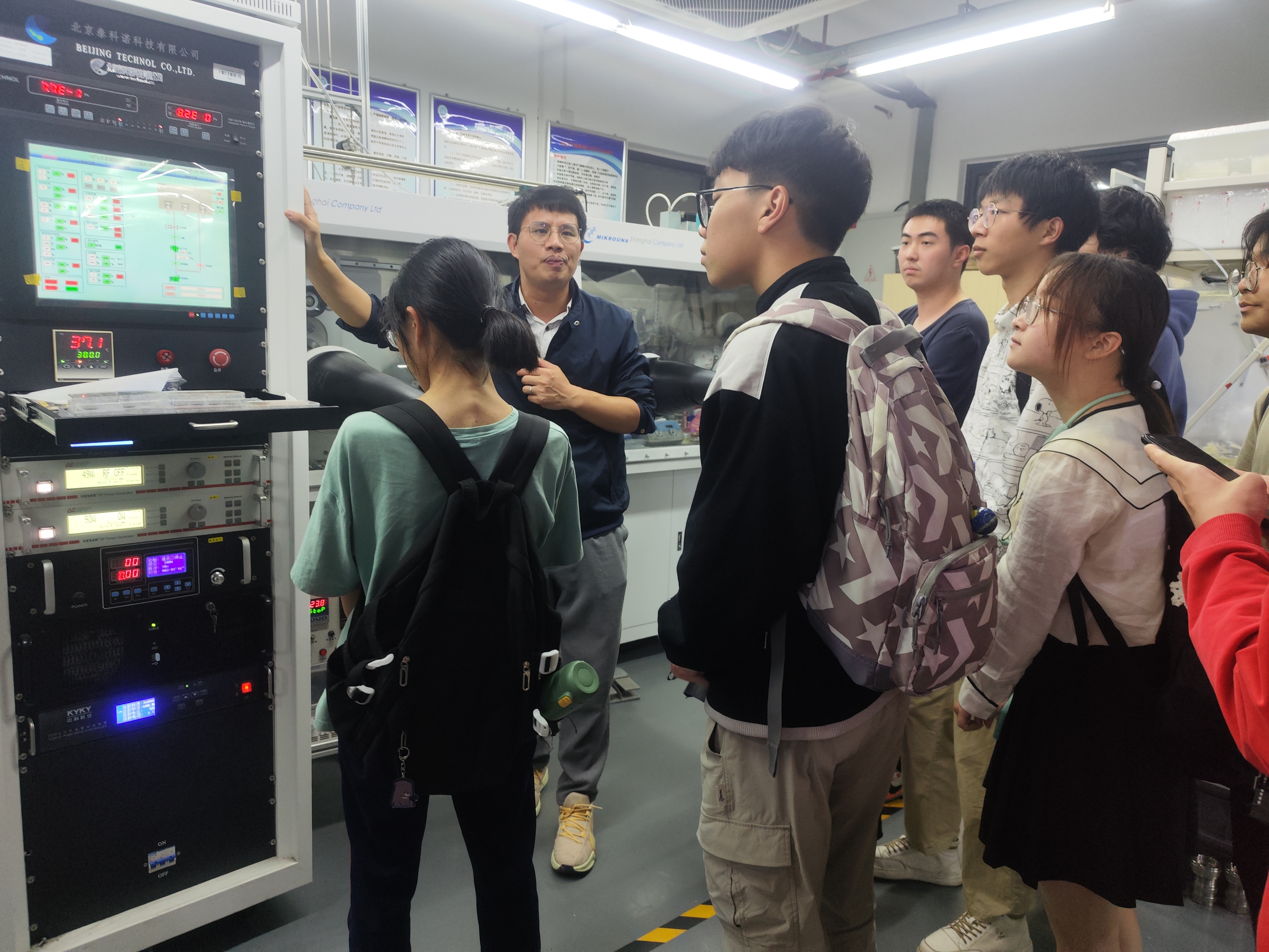 微体验环节,电子专业研究生第一党支部书记江艳婷带领师生到科技园阳光楼的实验室进行参观学习。王星辉教授对实验室各个小组的研究方向进行了详细介绍,同时为同学们讲解了一些实验仪器的使用原理,通过科学实验及科技体验等方式,激发学生科学兴趣,提升科技创新能力。