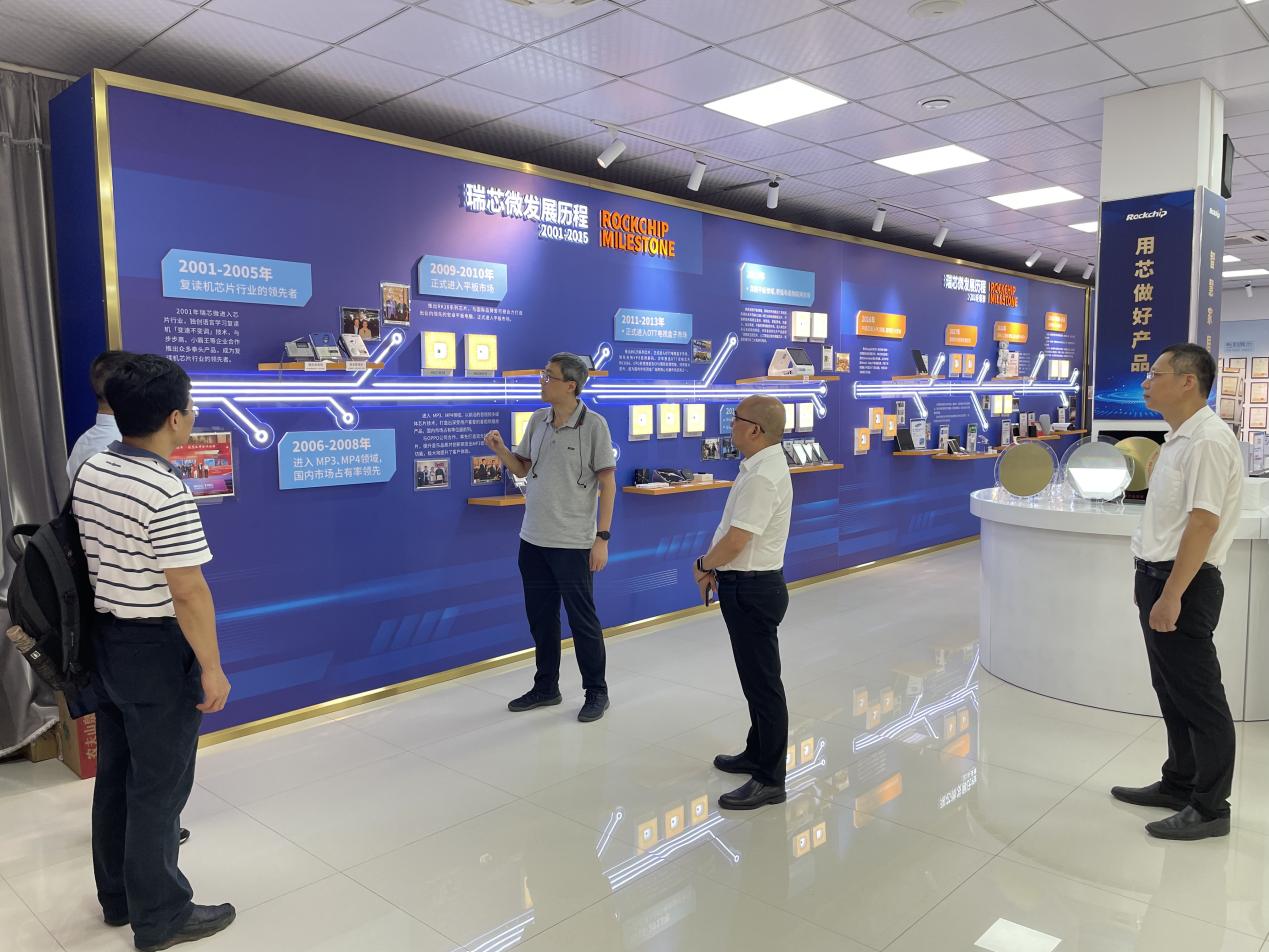 魏金明书记等一行在福州瑞芯微电子股份有限公司人力资源总监林兆强、福州IC平台经理陈丽君、招聘经理赖宁莎的陪同下,认真参观了企业发展展示馆,深入了解Av在线看、产品研发、生产管理与行业发展等情况。
