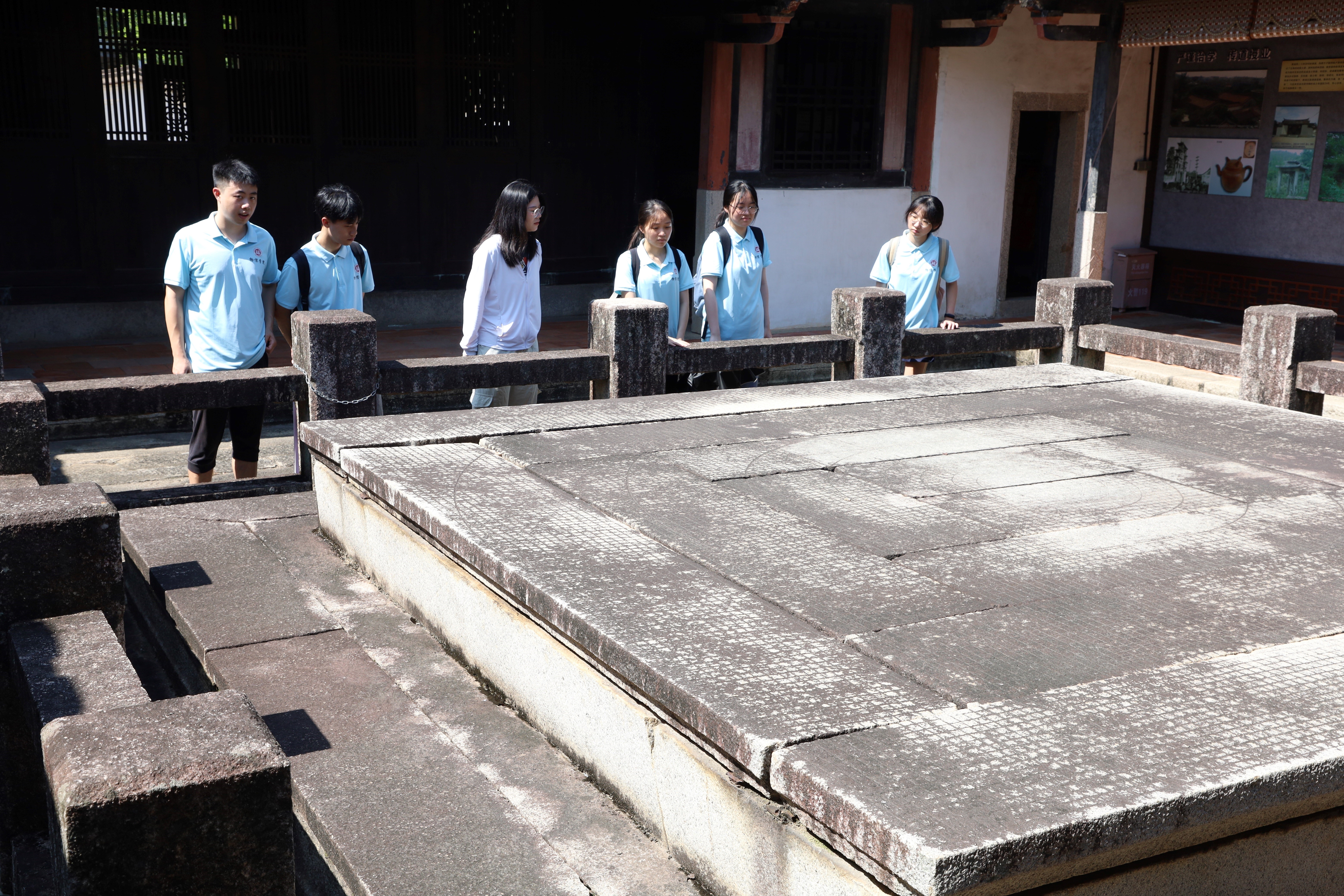 再往里走,赫然入目的是一个约四米宽的石案——天方盘。讲解员向实践队员介绍道,黄道周回乡设计并制作此盘,目的主要是配合教授《三易洞玑》等易学时作直观教具,同时用以研究天象变化,测知天气阴晴风雨。黄道周精通天文历数,当时闽、浙、粤三省前来听讲的学生达到千余人,实践队员围在天方盘旁,仿佛又见古书满架,学子争观,书院墨客云集之景。