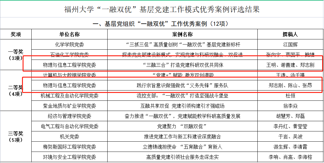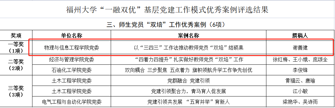 在今年获奖案例中,《“三融三合”打造党建科研双优共同体》获得基层党组织“一融双优”工作优秀案例一等奖,《践行宗旨意识做强做优“义务先锋”服务队》获得基层党组织“一融双优”工作优秀案例二等奖,《以“三四三”工作法推动教师党员“双培”结硕果》获得师生党员“双培”工作优秀案例一等奖。