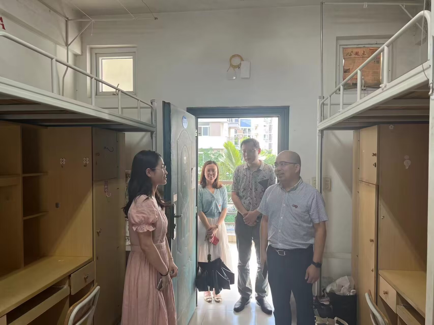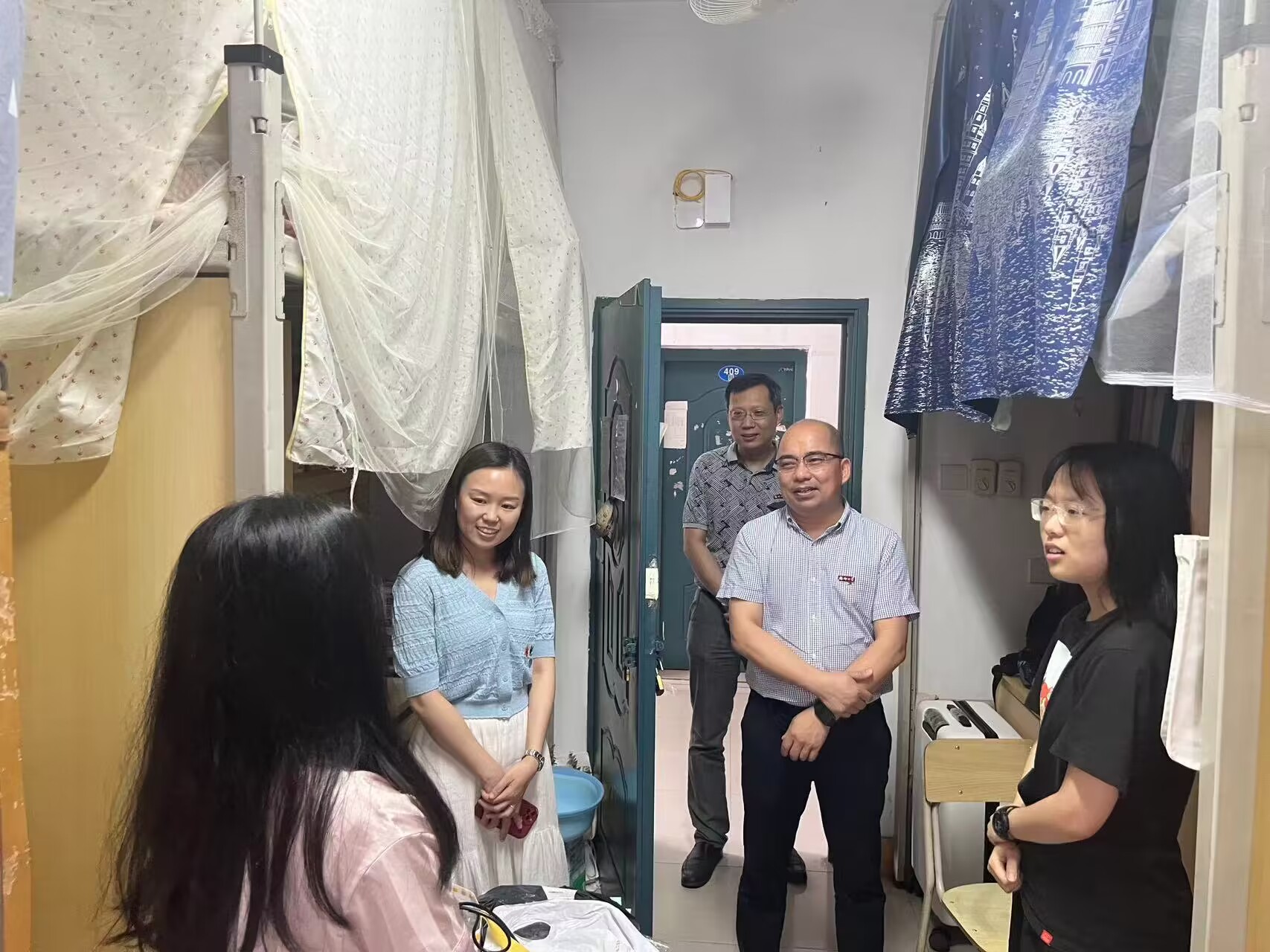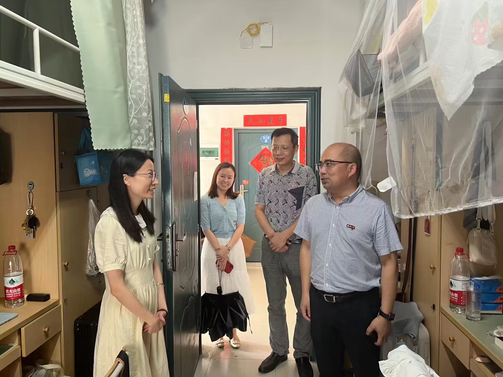 为深入学习贯彻习近平新时代中国特色社会主义思想,推进主题教育走深走实,进一步做好毕业生文明离校工作,6月19日下午,学院党委书记魏金明、党委副书记郑志刚、毕业班辅导员苏海姬以及研究生辅导员陈晓峰一同前往2023届毕业生宿舍,关心慰问即将开启人生新篇章的学生们。