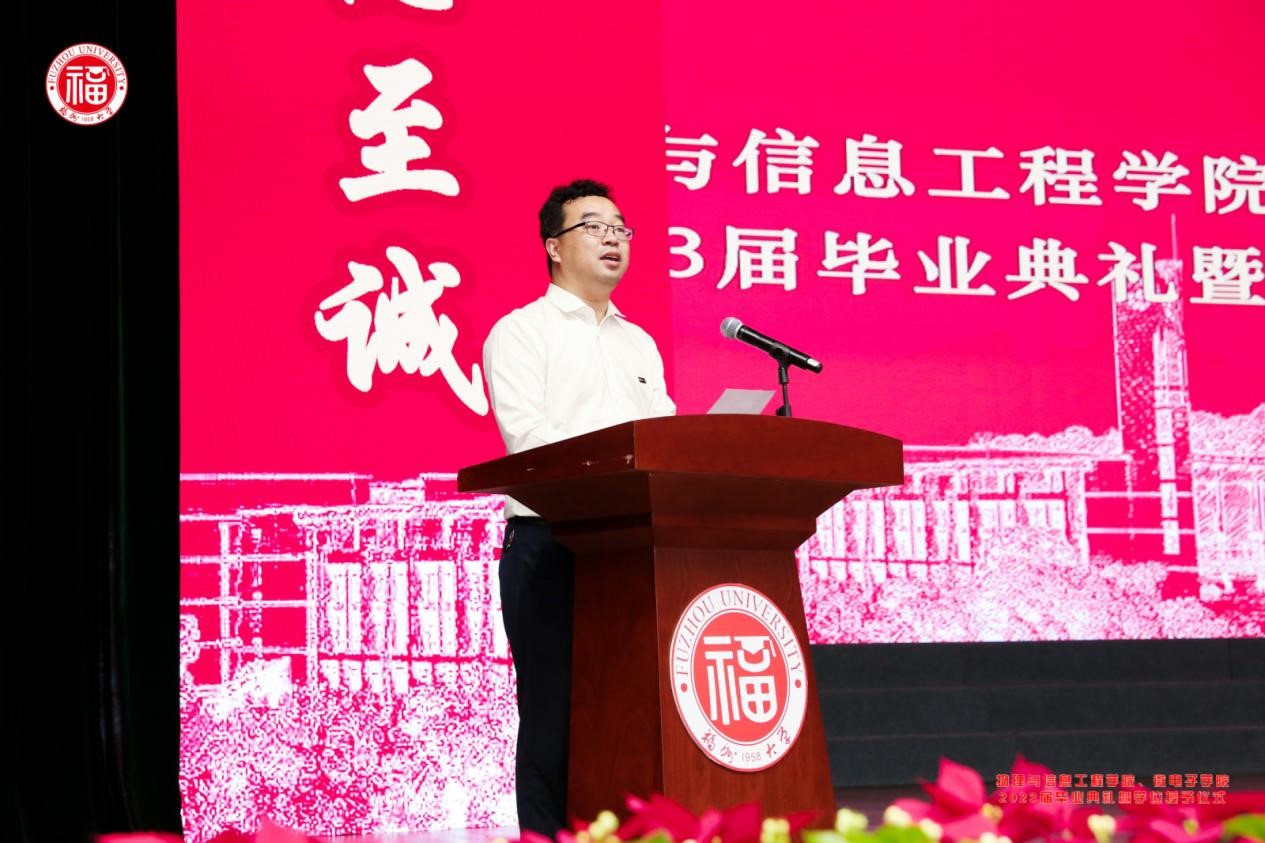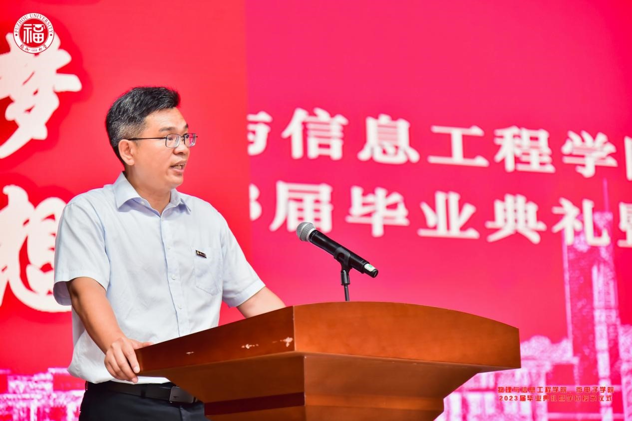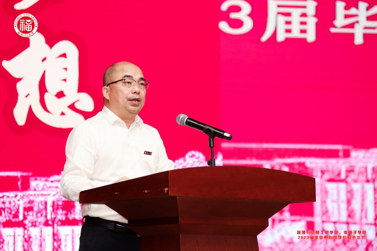 学院党委魏金明书记发表毕业致辞。他首先代表学院党政领导和全院师生对圆满完成学业的本、硕、博的莘莘学子表示热烈祝贺,并与大家一铜总结回顾了学院近年来在学科发展、科研创新以及学生工作上取得的成就。紧接着,魏金明书记对毕业生提出了三点离别嘱托:一是要一是要修身自律,终身立德。二是要自主学习,终身学习。三是要久久为功,终身实干。在致辞最后,书记殷切嘱托毕业生需秉承母校“明德至诚,博学远志”校训,成为母校三种精神的发扬者、传承者、实践者,为全面建设社会主义现代化国家、全面推进中华民族伟大复兴贡献福大物信人的力量。