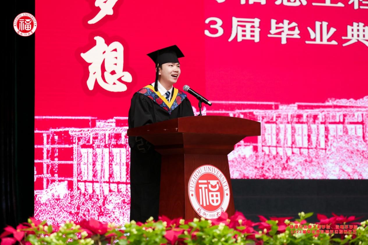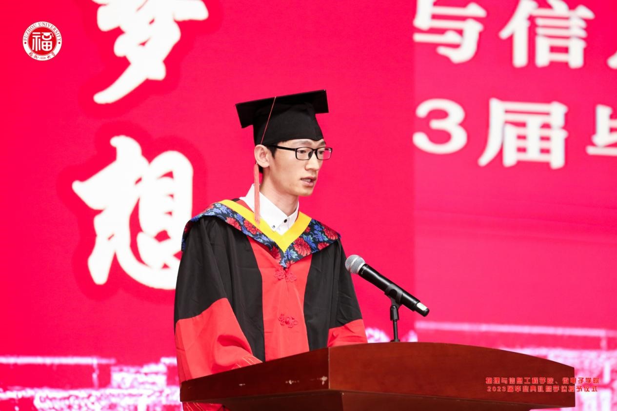 研究生毕业生卢箫扬同学在发言中回顾了自己福大十年的求学经历,提出校园生活中最令人难忘的三点:一是“专”的勤奋求索;二是“念”的深厚情谊;三是“追”的远大梦想。今后,自己将铭记母校和学院的深情厚谊,开启下一段旅程。