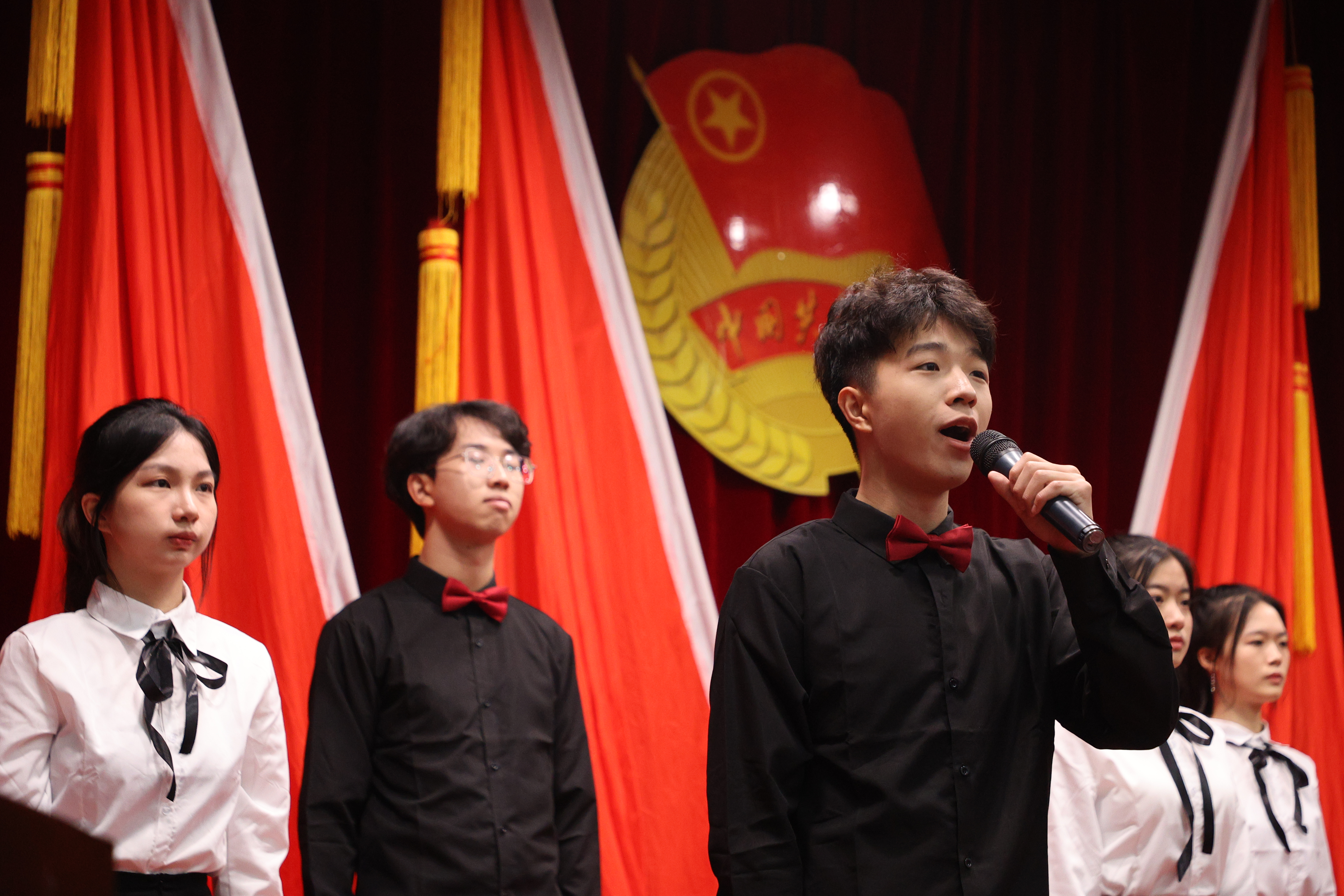 颁奖仪式后,先进个人代表依次分享。校十佳大学生,全国五四红旗团支部义务维修队团支部支书李松壕同学上台发言。他结合自身在学院支持下不断提高课内学习和竞赛实践水平的经历,大力号召全体青年接续起前辈们手中的接力棒,一起为团队、为学院、为国家贡献出自己的力量。