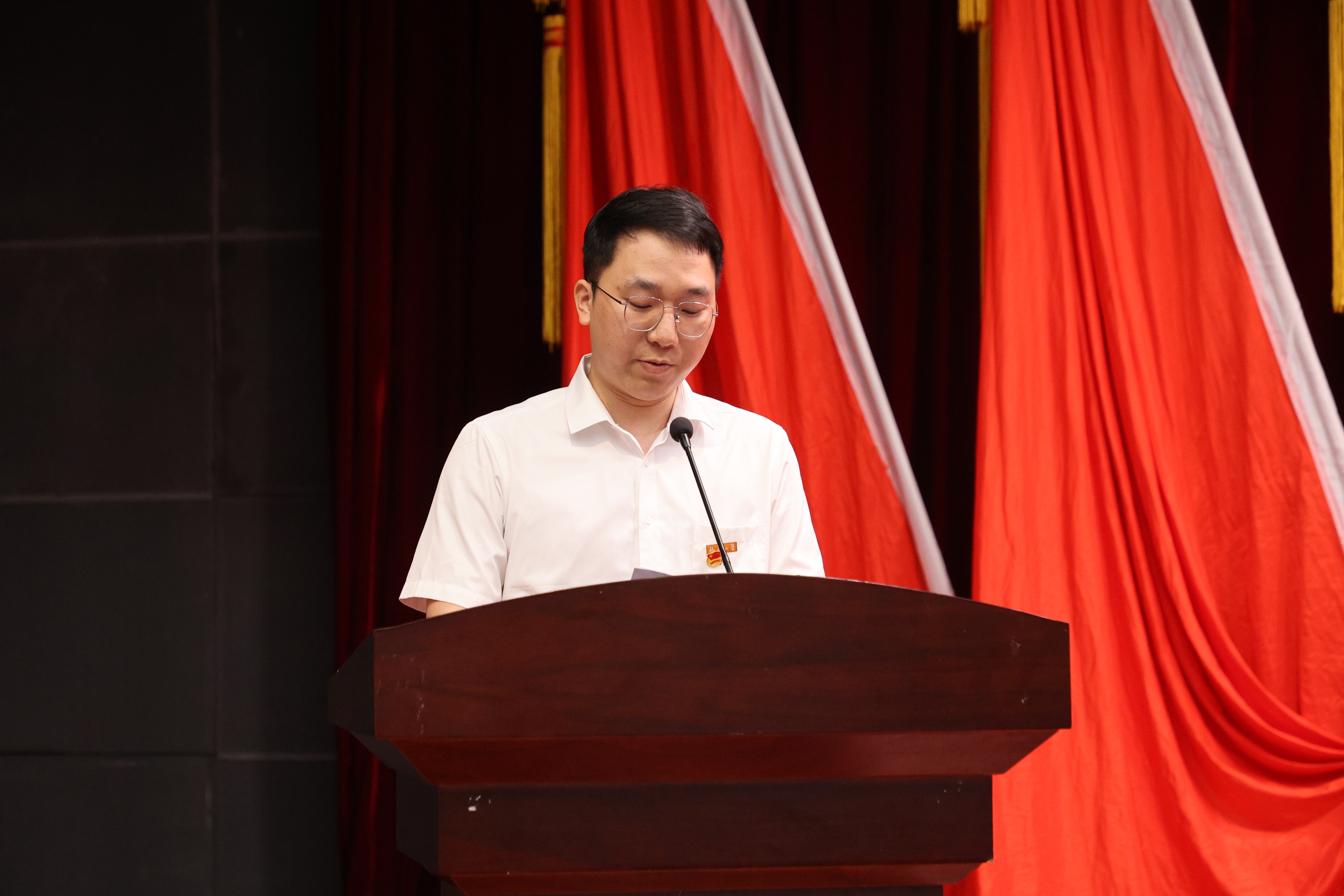 全国青马工程学员王少彬同学在发言中分享了自身成长故事。他努力探索突破自我边界,成功保研至厦门大学;在集体中共同成长,得到同学们的一致认可;努力融入时代,将专业所学与时代紧密结合,荣获众多奖项。他用慷慨激昂的话语激励广大物信学子,努力争做有理想、敢担当、能吃苦、肯奋斗的新时代优秀青年!