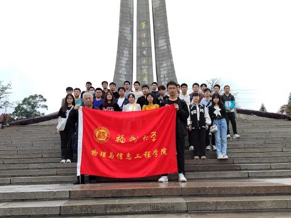 祭扫活动结束后,物信学子齐聚在纪念碑下合影留念。现场同学们有幸和原物理无线电系康永辉教授一起合影留念,康永辉教授也表达了对物信学子的关照与对牺牲先烈的缅怀。