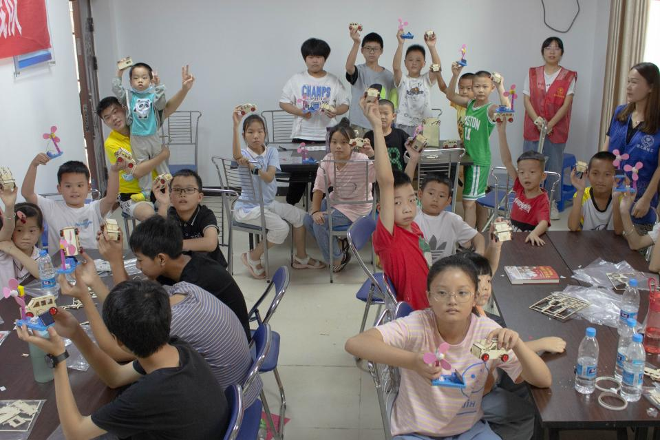 在科技启蒙课堂的教学中,实践队队员们通讲述了声音的产生、光的折射和摩擦起电等有趣自然物理现象,和小朋友一起制作太阳能风扇和回力拉线小车等,引导小朋友去理解生活中常见的物理现象,培养其对自然科学的探索兴趣。