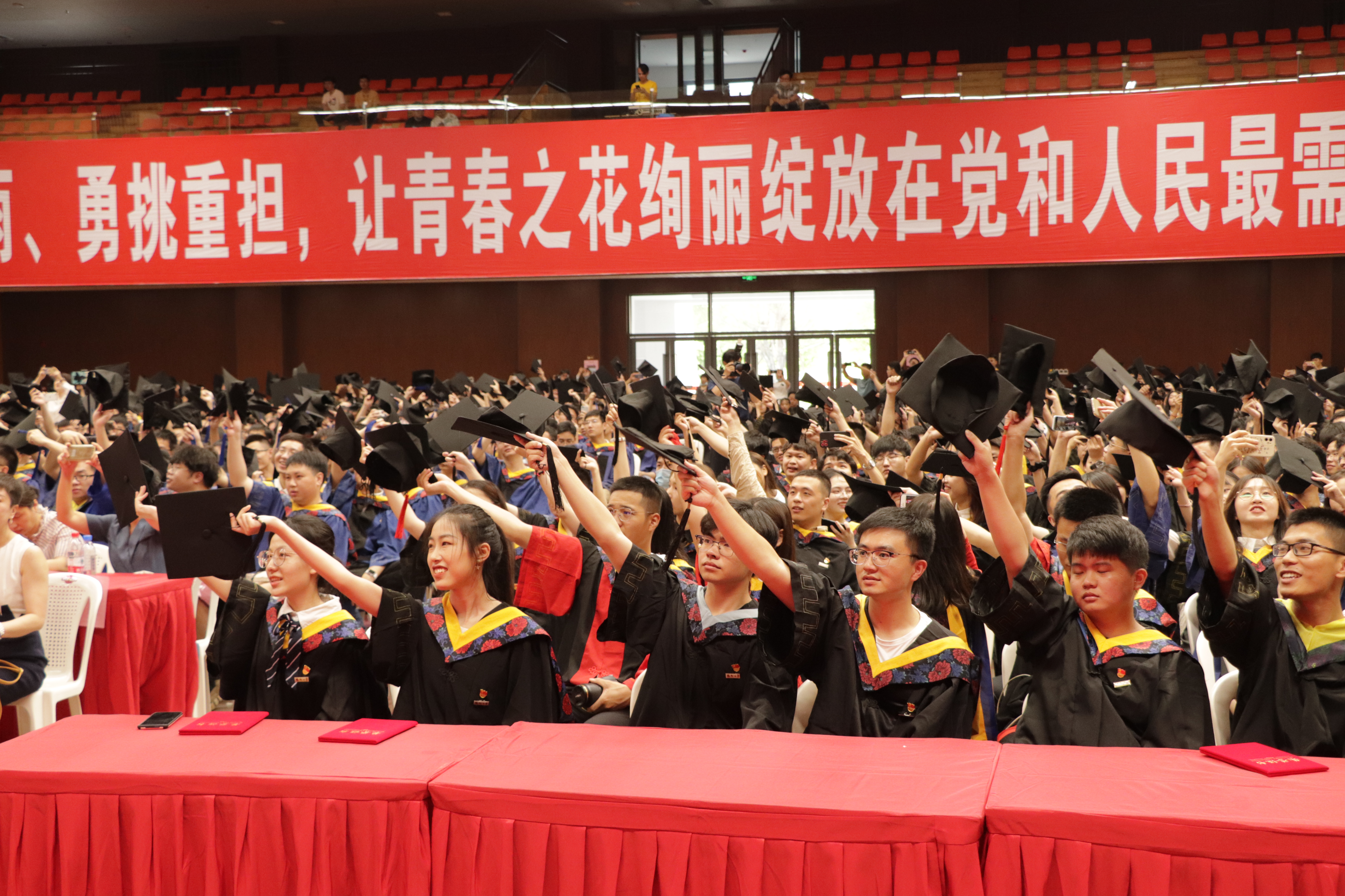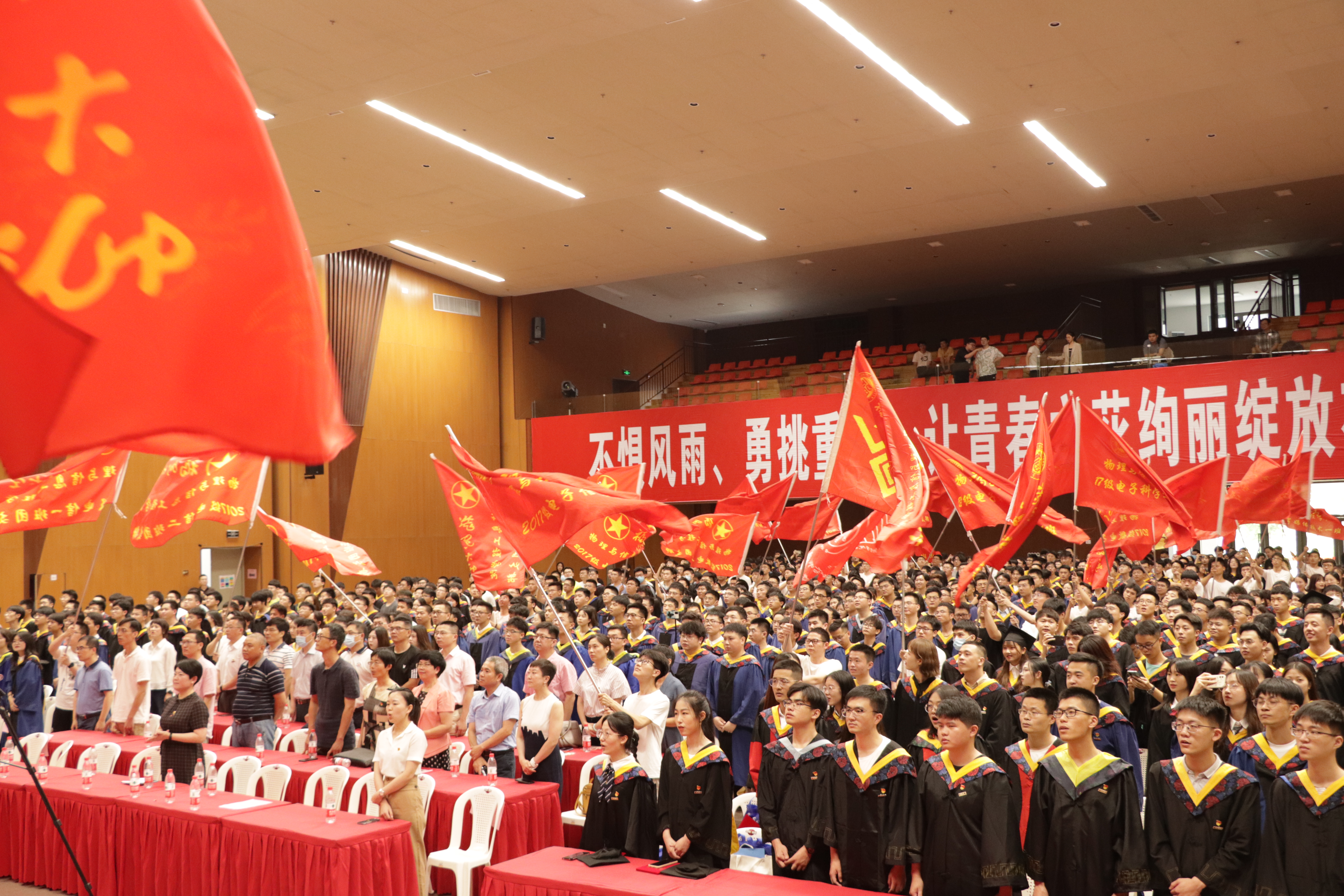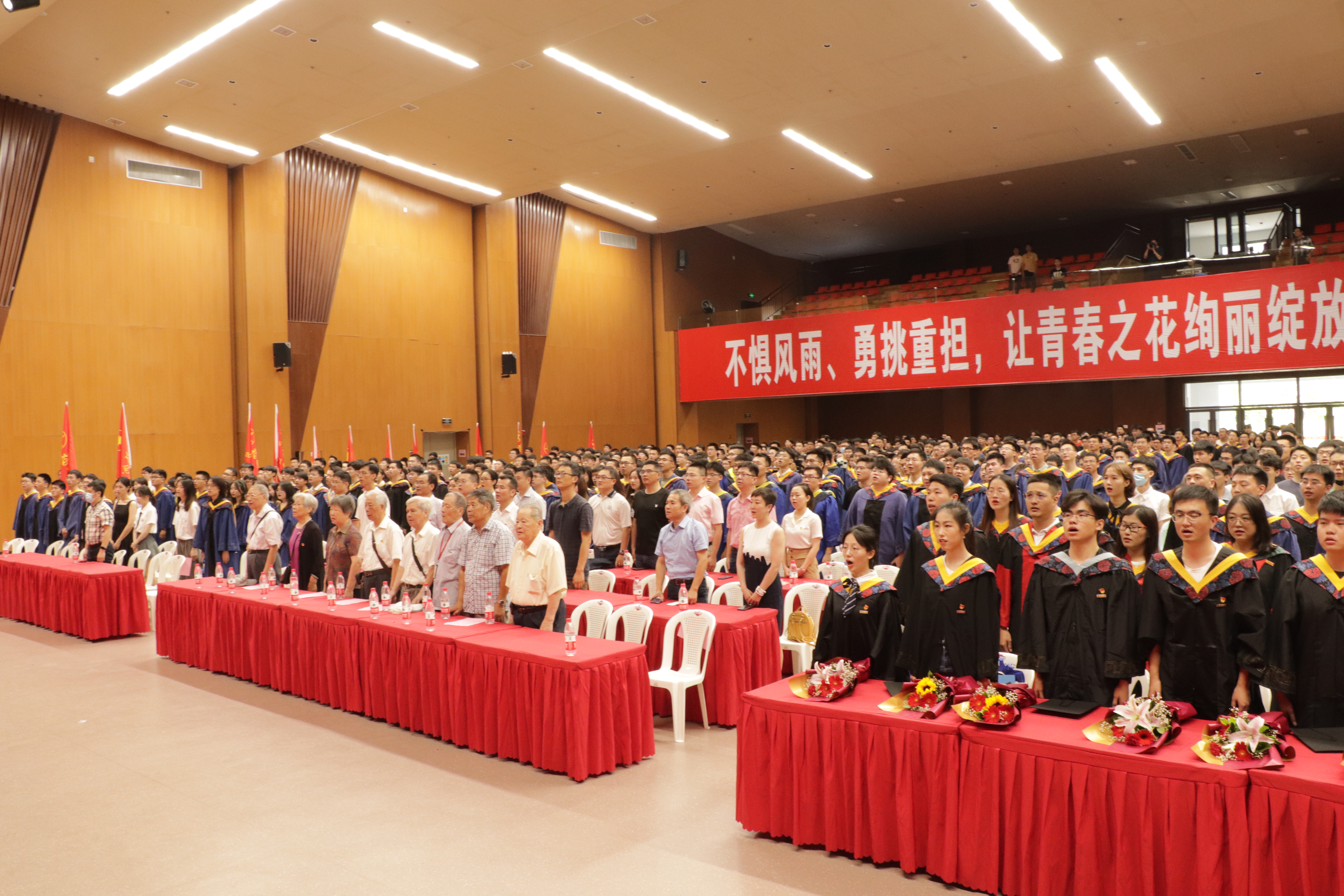 校歌,并举办了跑旗仪式,在国旗、党旗、团旗、校旗、院旗的引领下,2021届各班级党、团支部旗帜呼应跟随,场馆内红旗舞动,寓意前程似锦、旗开得胜,祝福毕业生们扬帆起航,驶向更远的彼岸。