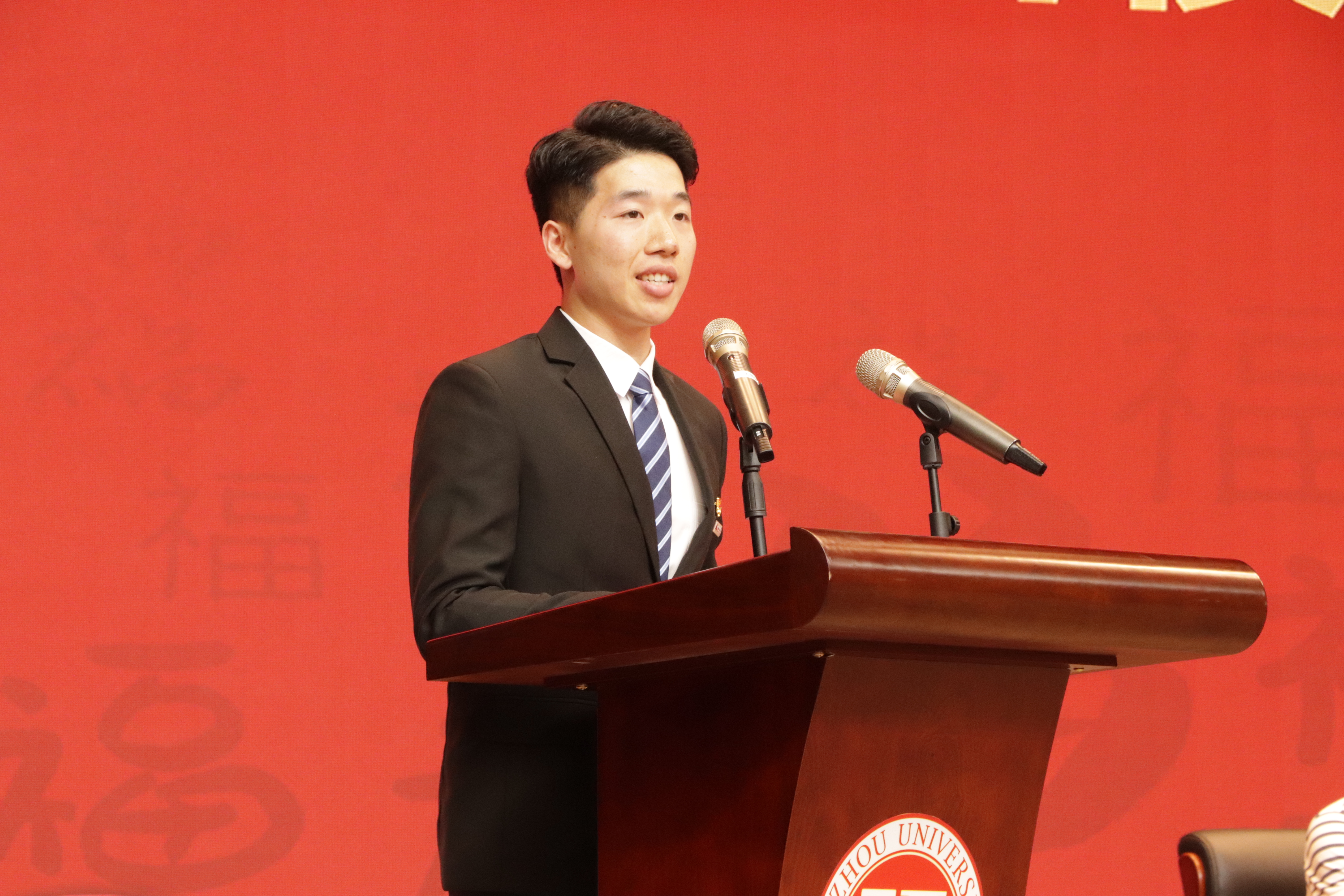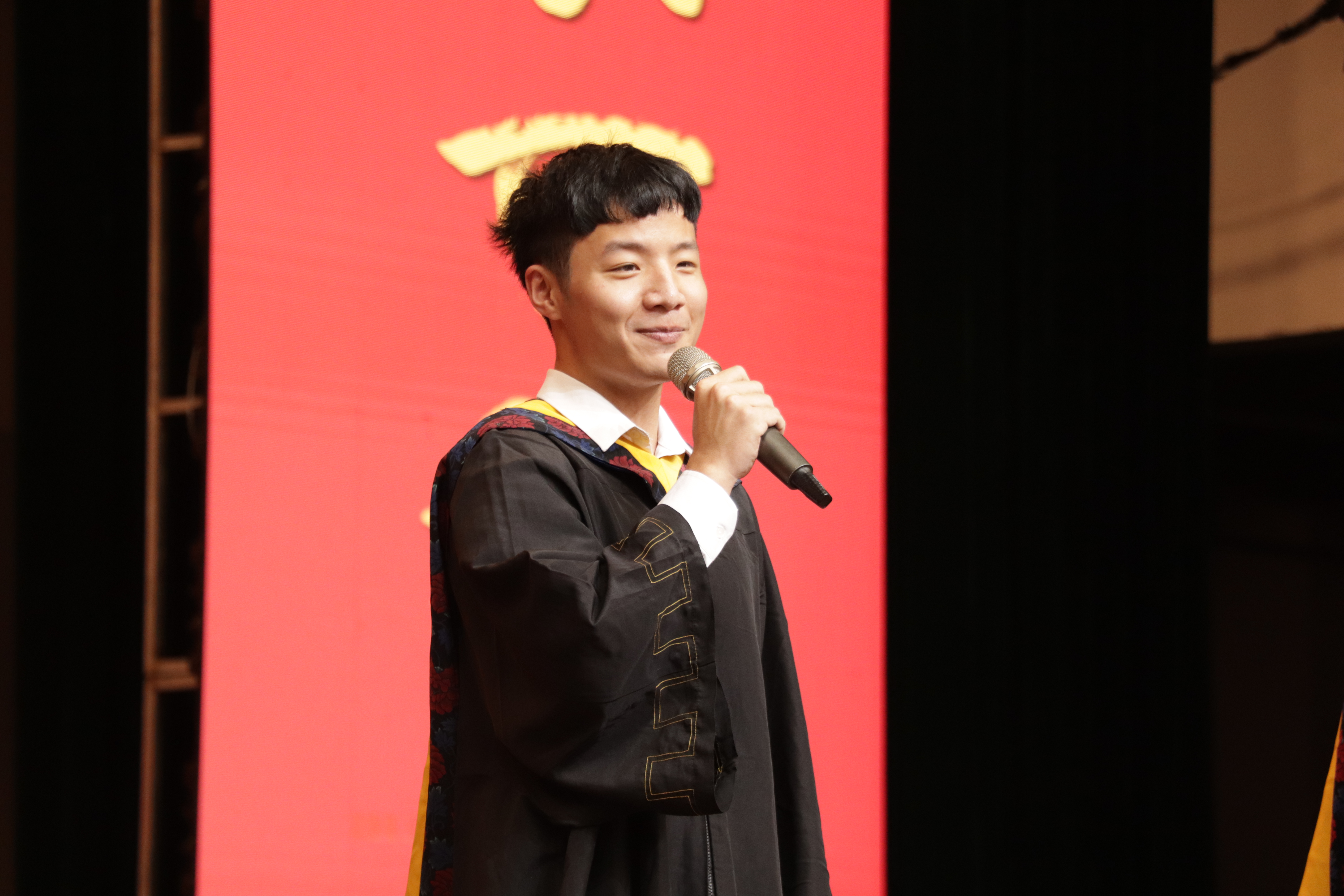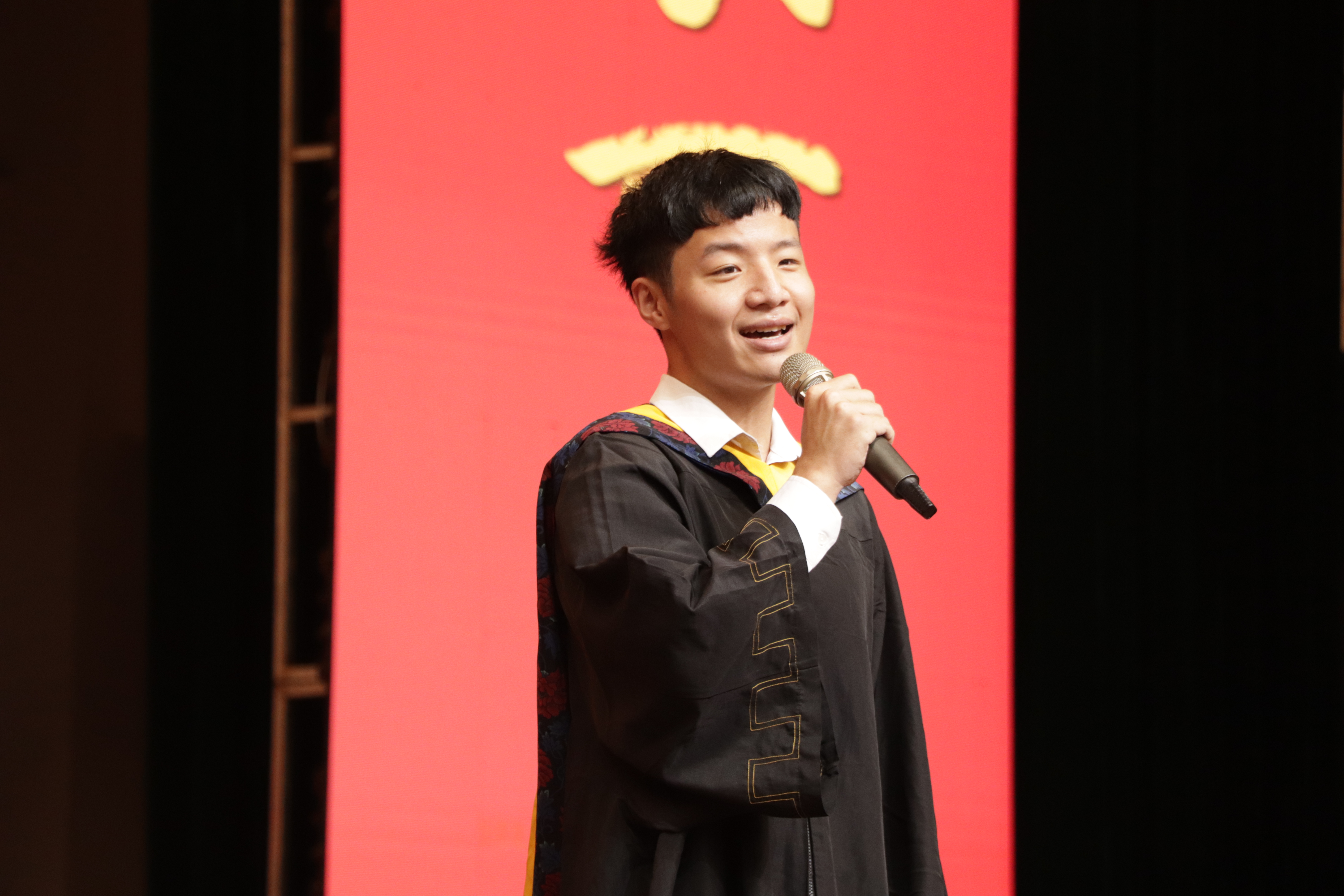 典礼的第二篇章“诉衷情:朝花夕拾,共筑荣光”由2020届校友代表黄飞鸿、2021届研究生毕业生代表施逸青、2021届本科生毕业生代表张新宇、2021届毕业生家长代表王光耀以及教师代表赵铁松老师依次发言。