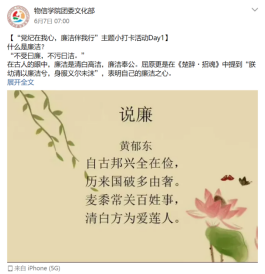 此外,廉洁主题打卡活动也取得明显的成效,通过每日推送廉洁相关的内容,引导同学们深入理解廉洁文化的内涵,鼓励他们在日常生活中积极践行廉洁精神,让“廉洁”理念更加深入人心。活动期间,物信学院文化部官方QQ空间成为传播廉洁文化的重要平台。每天,该平台都会精心推送一条与廉洁紧密相关的内容,包括富含哲理的廉洁诗句、描绘廉洁人物和故事的精彩篇章等。这些推送内容不仅涵盖了丰富的廉洁文化知识,更以优美的诗句和引人入胜的故事,彰显了廉洁文化精神,进一步弘扬了廉洁文化的正能量。