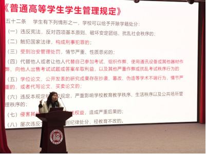 紧接着,2023、2024级研究生辅导员吴雨桐老师召开年段大会,年段会从常规工作强调、法纪警示教育案例学习、研究生违纪处分条例学习、本学期工作总结及下学期计划安排四个方面开展。在法纪警示教育案例学习方面,吴老师通过运用一系列详实的典型案例和身边人身边事开展法纪警示教育,包括考试作弊、酗酒、侵犯他人隐私、偷窃、诈骗、侵犯他人名誉和寻衅滋事等,并带领研究生们学习了研究生违纪处分条例相关内容,教育大家做守规矩、讲原则、有担当的新时代研究生。