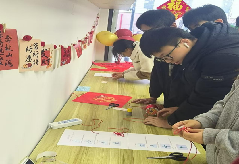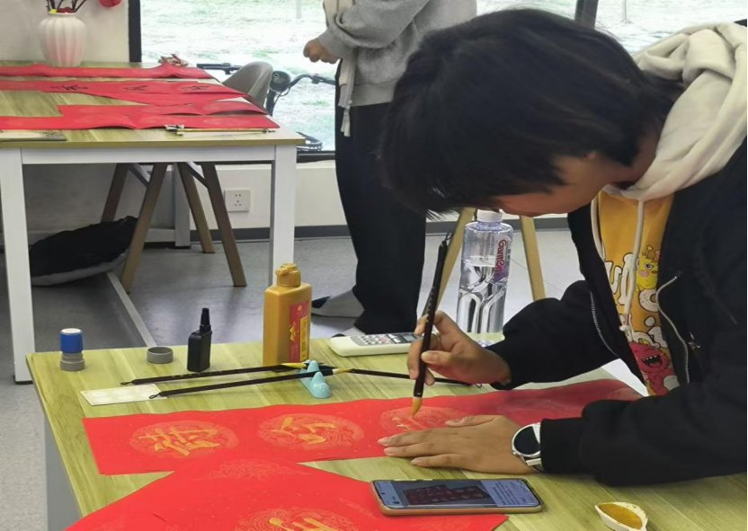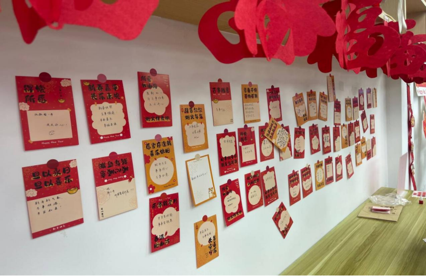 “疯狂套圈圈”现场不时响起阵阵欢呼声与喝彩声;墨香四溢的 “笔下生花”一幅幅对仗工整、笔力刚劲、意境优美的对联跃然纸上;“DIY中国结”的编织创作引导学生弘扬中华优秀传统文化;“纳福签到”环节用手机定格青春洋溢、活力四射的画面;“卡上留‘新’愿”成为情感与希望交织的海洋,在一张张精美的卡片上书写下对新年的美好祝愿和期许。