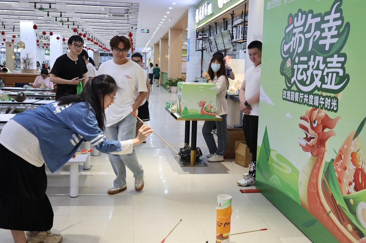 包粽子环节结束后,投壶活动也精彩上演。食堂内摆放着几个精美的投壶,周围围满了跃跃欲试的同学。投壶是中国古代传统的礼仪和游戏,同学们对这个古老的游戏充满了好奇与热情。大家依次排队,手持箭矢,瞄准壶口,用力投掷。箭矢在空中划过一道道优美的弧线,有的精准落入壶中,引得周围同学欢呼喝彩;有的则擦壶而过,让人不禁发出阵阵惋惜之声。现场气氛紧张而热烈,同学们在游戏中感受到了传统文化的独特魅力。