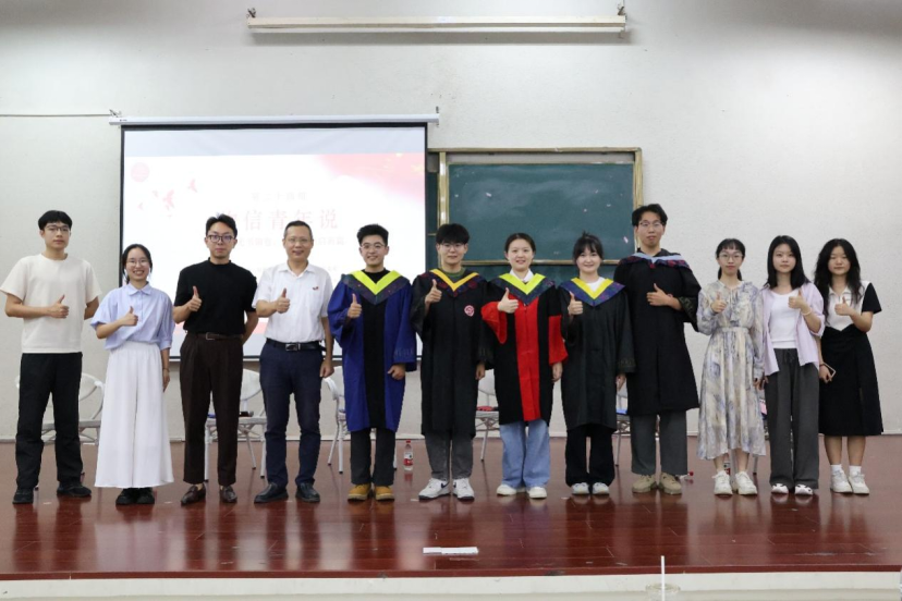 2025届优秀毕业生荣誉的优秀学子作为嘉宾为低年级学生带来了一场关于学术追求与人生规划的精彩对话:陈丹杰分享了自己的升学选择与心路历程,强调“科研能力是名校敲门砖”,过硬的个人能力是成功的关键;俞子涵以“边缘保研者”的身份,鼓励学生“主动争取,勇于开口”;曹楷铭结合自己B站教学视频的意外走红事例,强调“分享知识是自我提升的过程”,帮助别人的同时也提升了自己;郭焱民以自己研究方向多次调整的经历为例,强调“咬牙坚持,走着走着就会豁然开朗”,坚持耕耘必会带来收获的信念;刘烨结合自己发表论文的经历,强调“科研需要预设质疑,经得起推敲才能走远”,严谨是科学研究中不可或缺的品质。