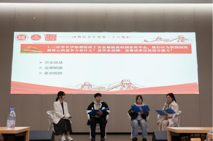 本期青年说访谈环节分成了上下半场,邀请到二位中国国际大学生创新大赛获奖者与三位国家奖学金获得者,通过深度访谈、项目路演与现场互动,分享他们在科技创新、学业精进、竞赛突围、学生工作等多维赛道上的实战经验与心路历程,为低年级同学呈现了一场关于创新实践、时间管理与综合成长的深度对话。