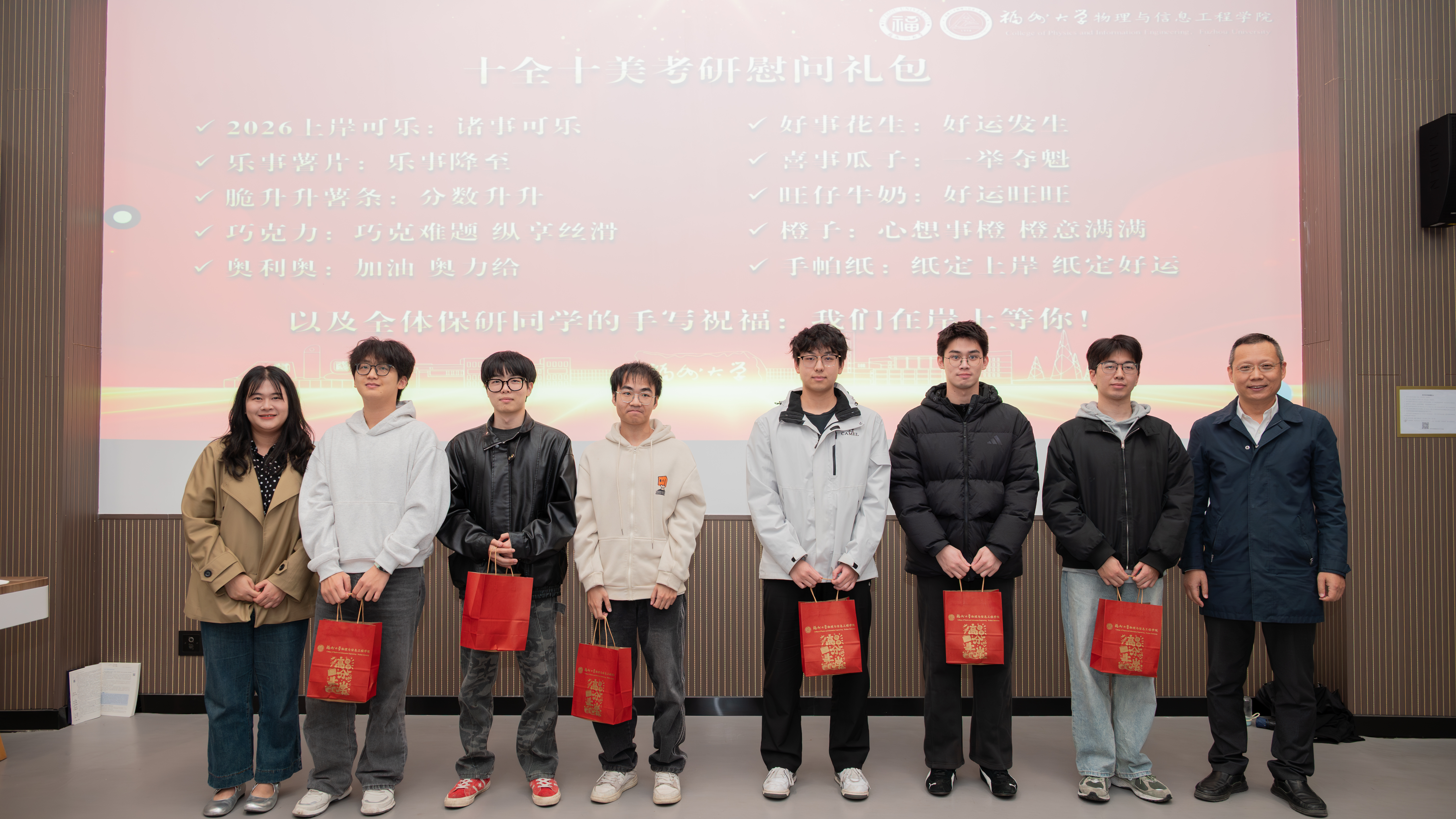现场,学院还为每位考生送上“十全十美考研慰问礼包”,礼包内包含定制励志书签、考试专用文具、暖心零食等实用物品,每一份心意都承载着学院对学子们的殷切祝福与全力支持。