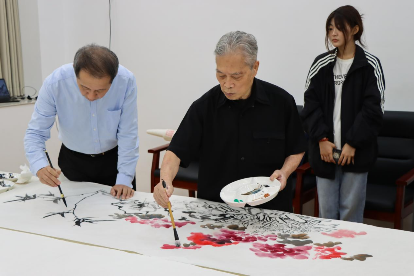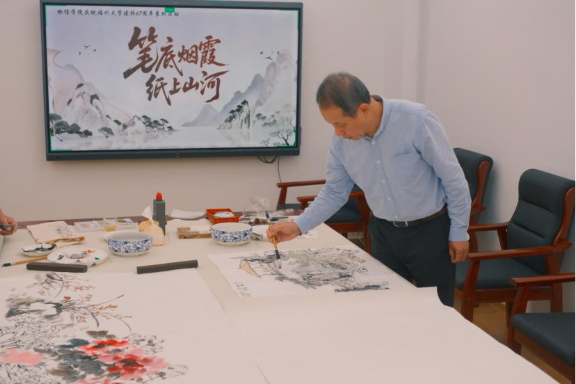 为共庆母校华诞,学院邀请书画艺术家和部分校友、在校学生共同参加“笔底烟霞,纸上山河”主题书画创作交流活动。大家挥毫泼墨,现场创作多幅书法和国画作品,以传统艺术形式献礼母校67周年校庆。活动现场,校友与在校生共同创作,分享书法技巧与绘画心得,近距离感受中华优秀传统文化的魅力。一帧帧书画,让春秋代序的校园故事在浓墨淡彩间永续流传。