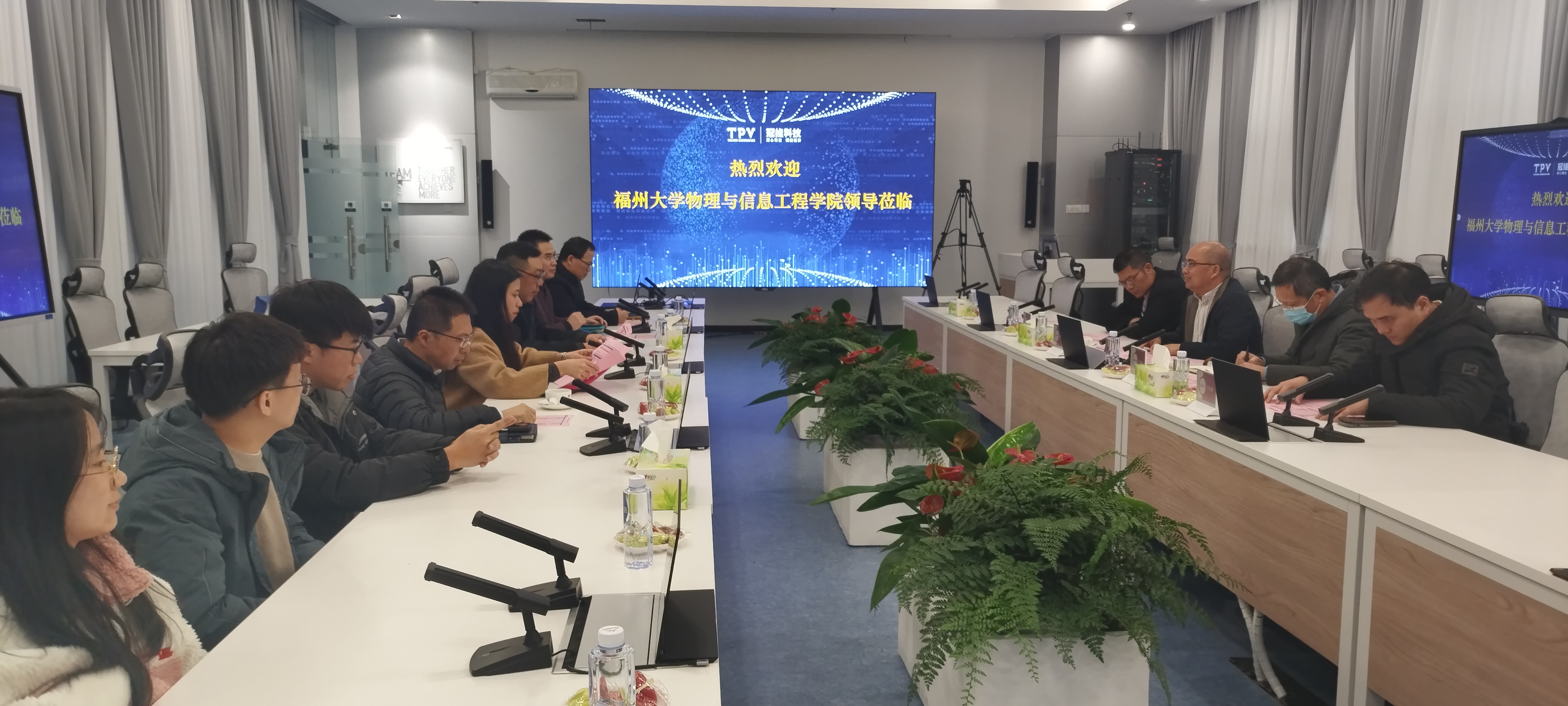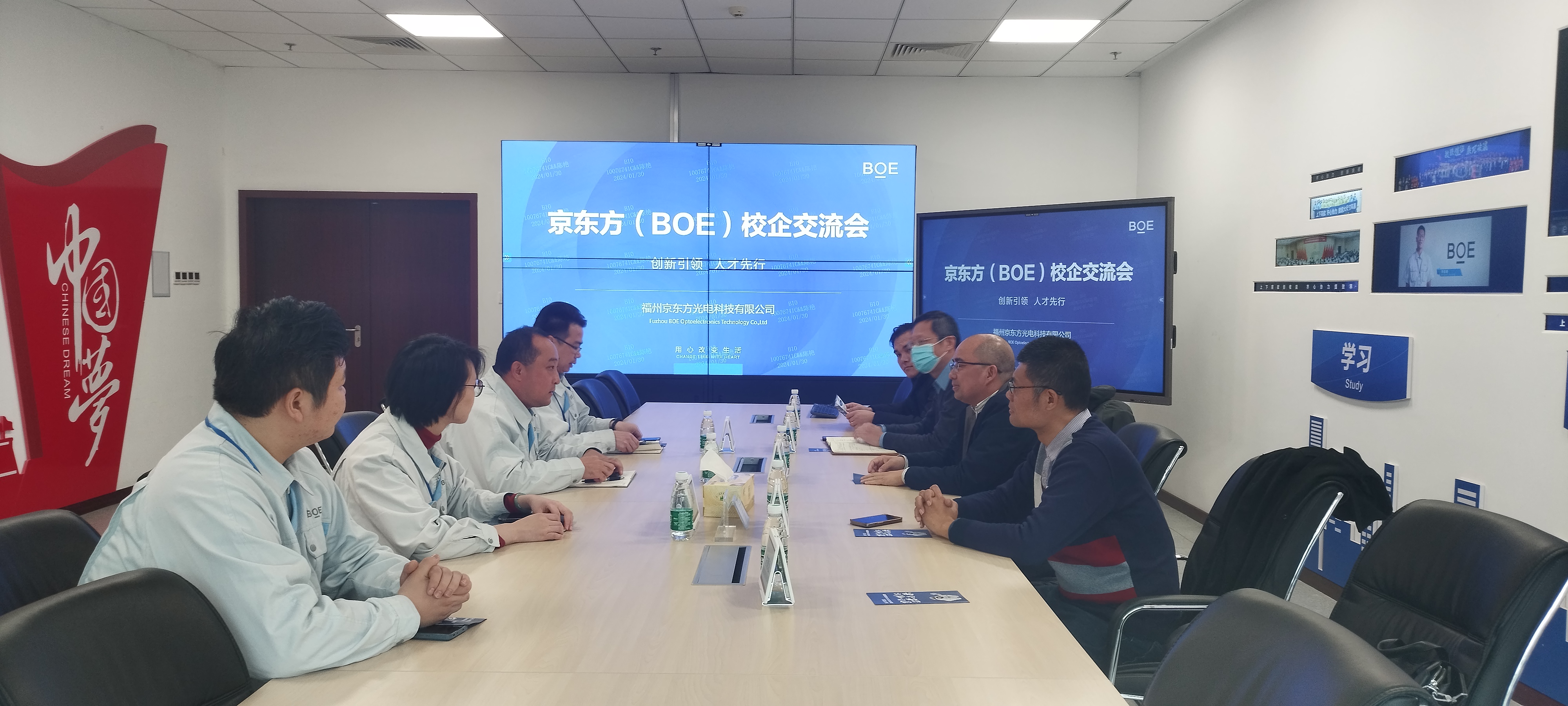 在福州京东方光电科技有限公司,魏金明书记一行首先参观了京东方产品展厅、灯塔工厂和工艺展厅,了解了公司发展历程,随后与福州区域办公室总经理徐东亮、福州京东方人力资源部经理华荣、福州京东方人力资源部招聘经理陈艳进行了座谈交流。座谈会上,双方就人才培养、企业的人才需求、毕业生招聘等方面进行了深入交流。最后,辅导员江良煊向企业转交了有意应聘京东方光电科技有限公司相应岗位的毕业生简历,精准服务学生就业。