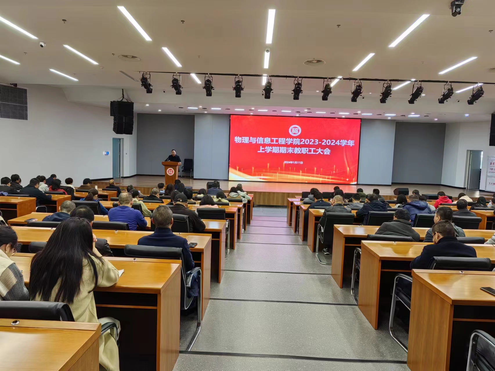 1月11日下午,物信学院在旗山校区晋江楼一楼报告厅召开2023-2024学年上学期期末教职工大会,全体教职工参加了会议。学院党委书记魏金明主持会议。