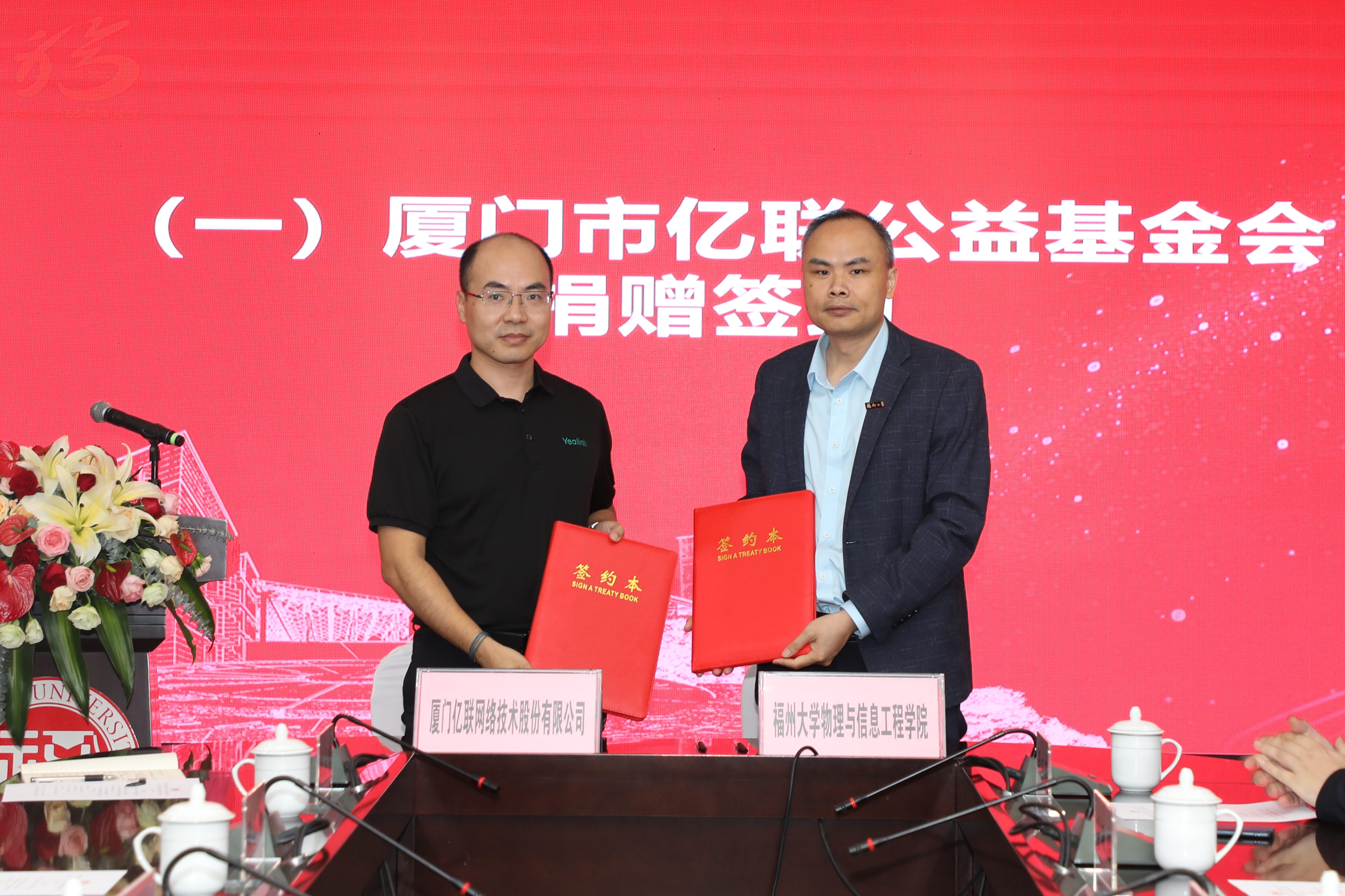 随后,物信学院分别与厦门市亿联公益基金会、锐捷网络股份有限公司签订捐赠及合作协议。两家单位的捐赠与合作将更好地助力学院事业发展。接着,学院党政主要领导为本次校庆期间为学院捐款捐物的校友及班级代表、企业代表颁发了感谢状。