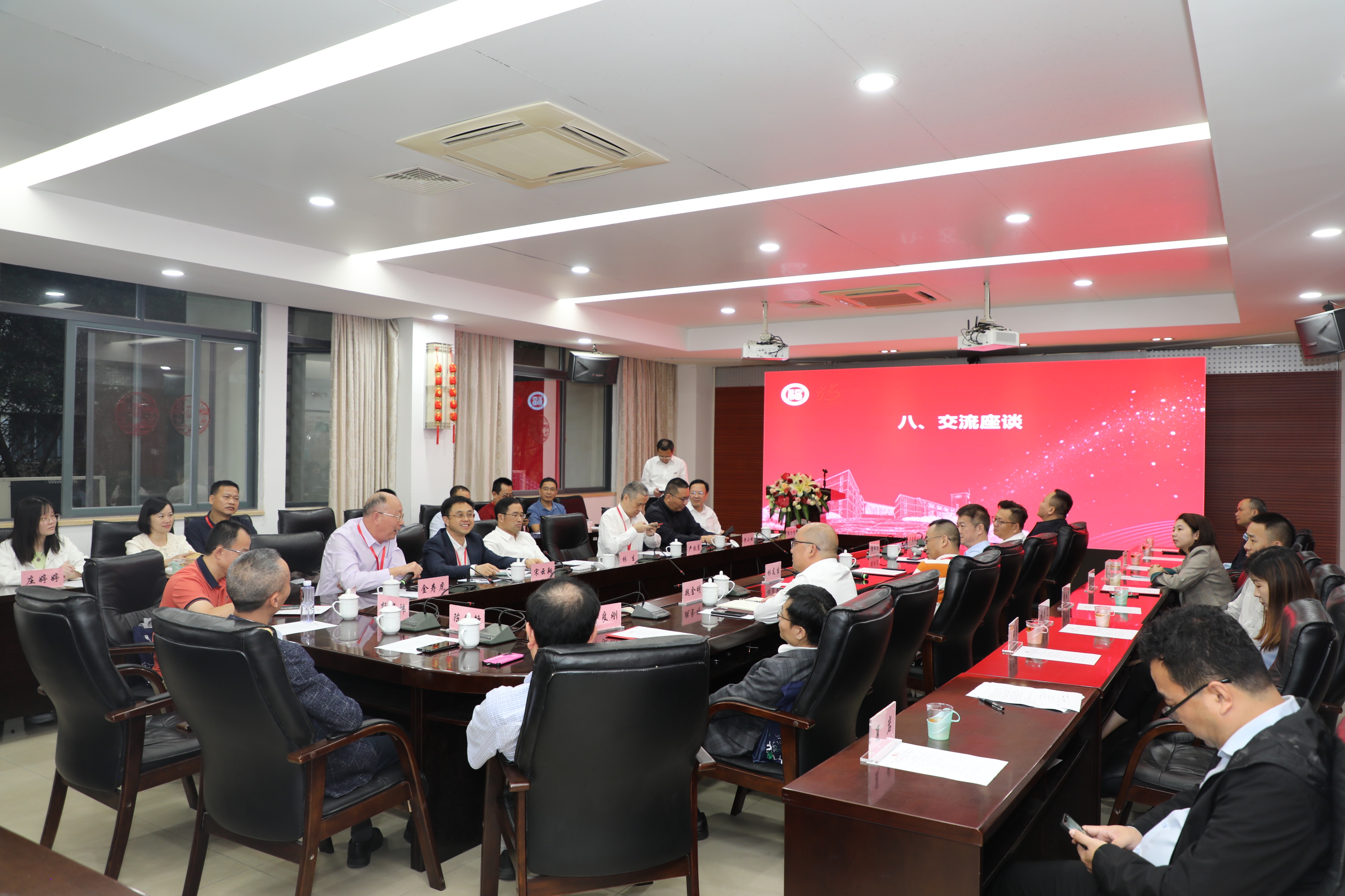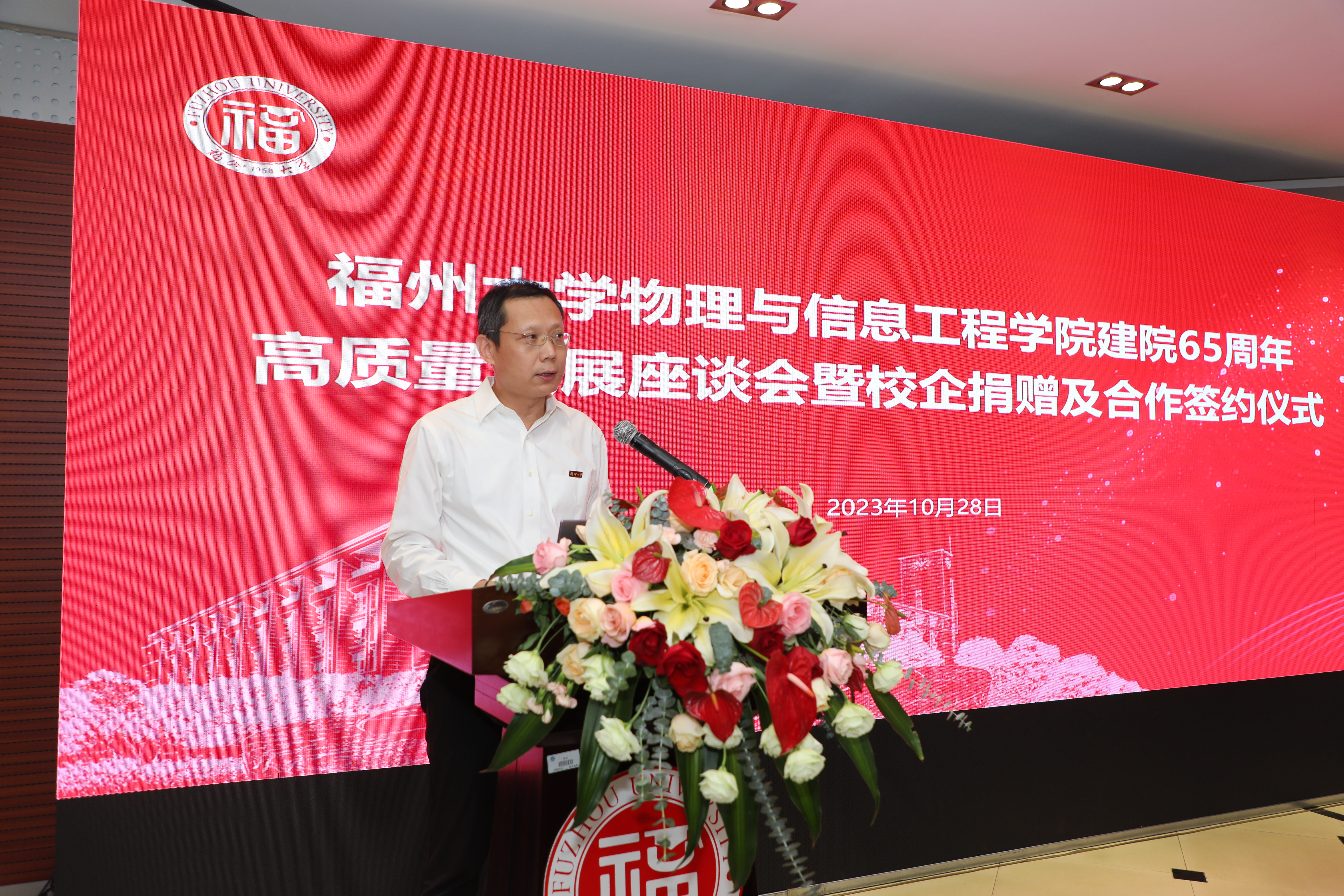 2023年10月28日下午,Av在线看 建院65周年高质量发展座谈会暨校企捐赠及合作签约仪式在物信南楼祥联厅举行。出席会议的有应邀参加建校65周年校庆活动的各位校友代表、捐赠合作企业代表、学院党政领导、师生代表等近40余人。会议由院党委副书记郑志刚主持。
