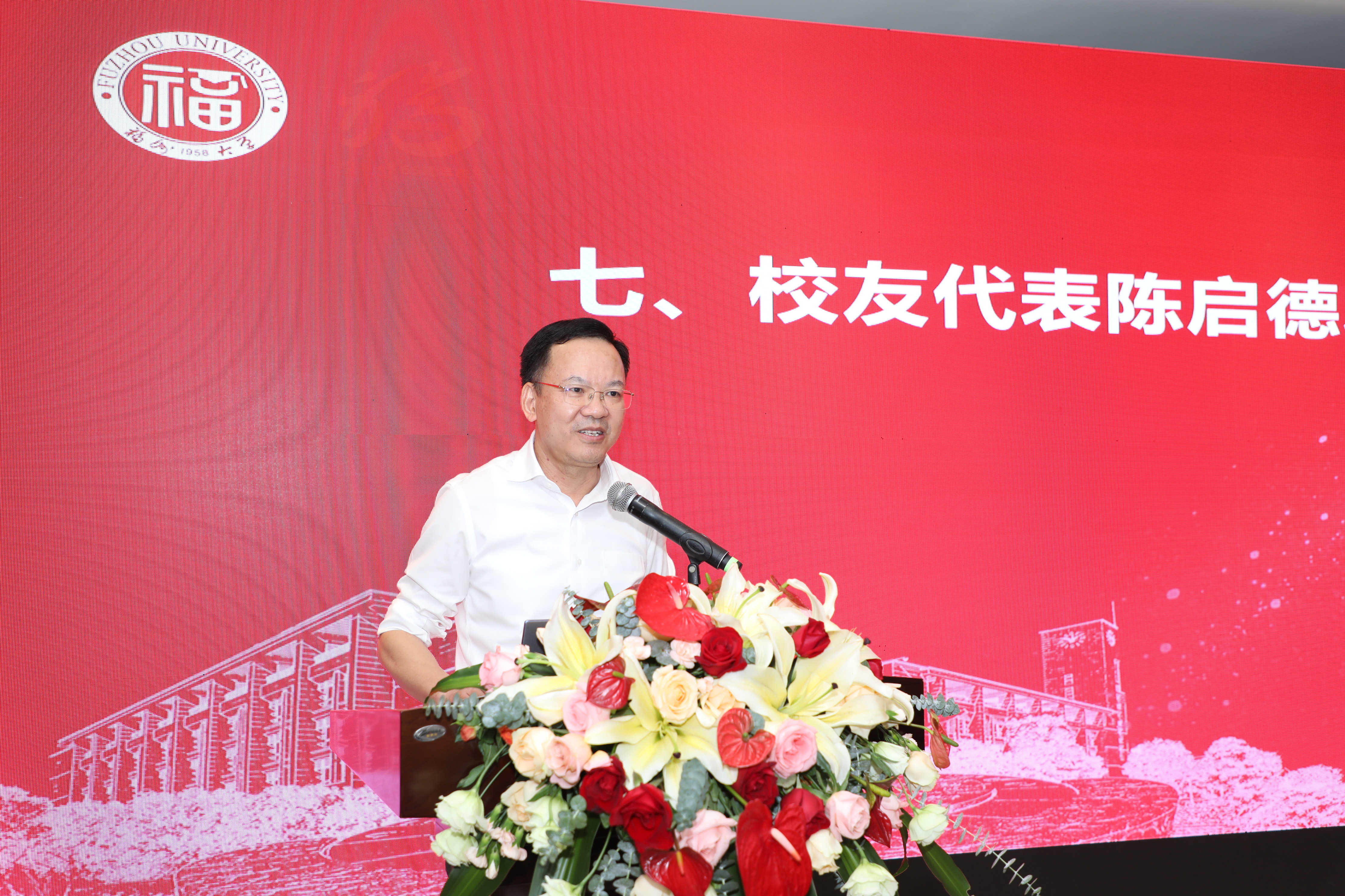 校友代表、Av在线看 福州校友会会长陈启德先生代表校友们对母校65周年华诞表示祝贺,他表示将会团结校友们继续关注、爱护、支持学院建设与发展。