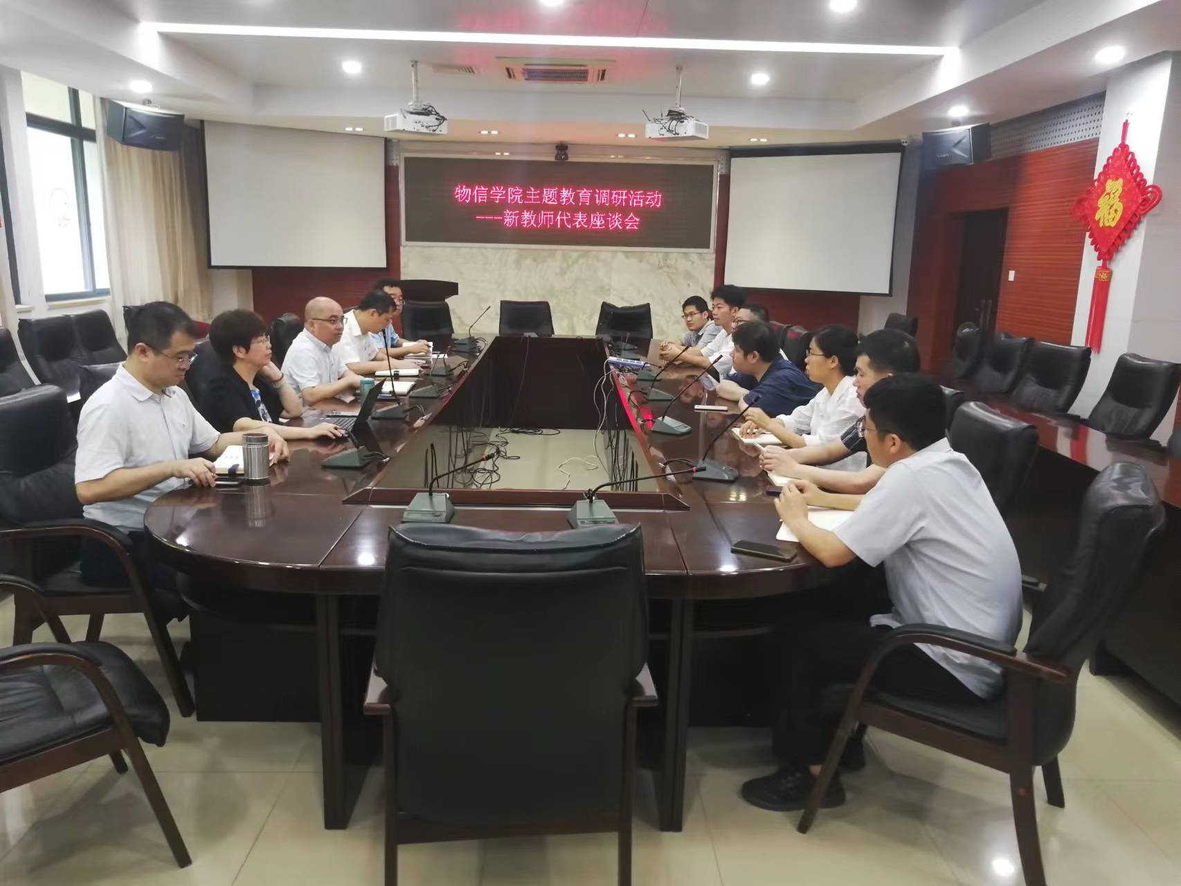 为推动学习贯彻习近平新时代中国特色社会主义思想主题教育走深走实,根据学院主题教育调研计划安排, 625日上午,物信学院召开新教师代表座谈会,围绕学院“一号工程”---新一代信息技术双一流学科群培育建设以及推动学院事业高质量发展进行调研。学院党政领导、新教师代表参加了调研座谈会。