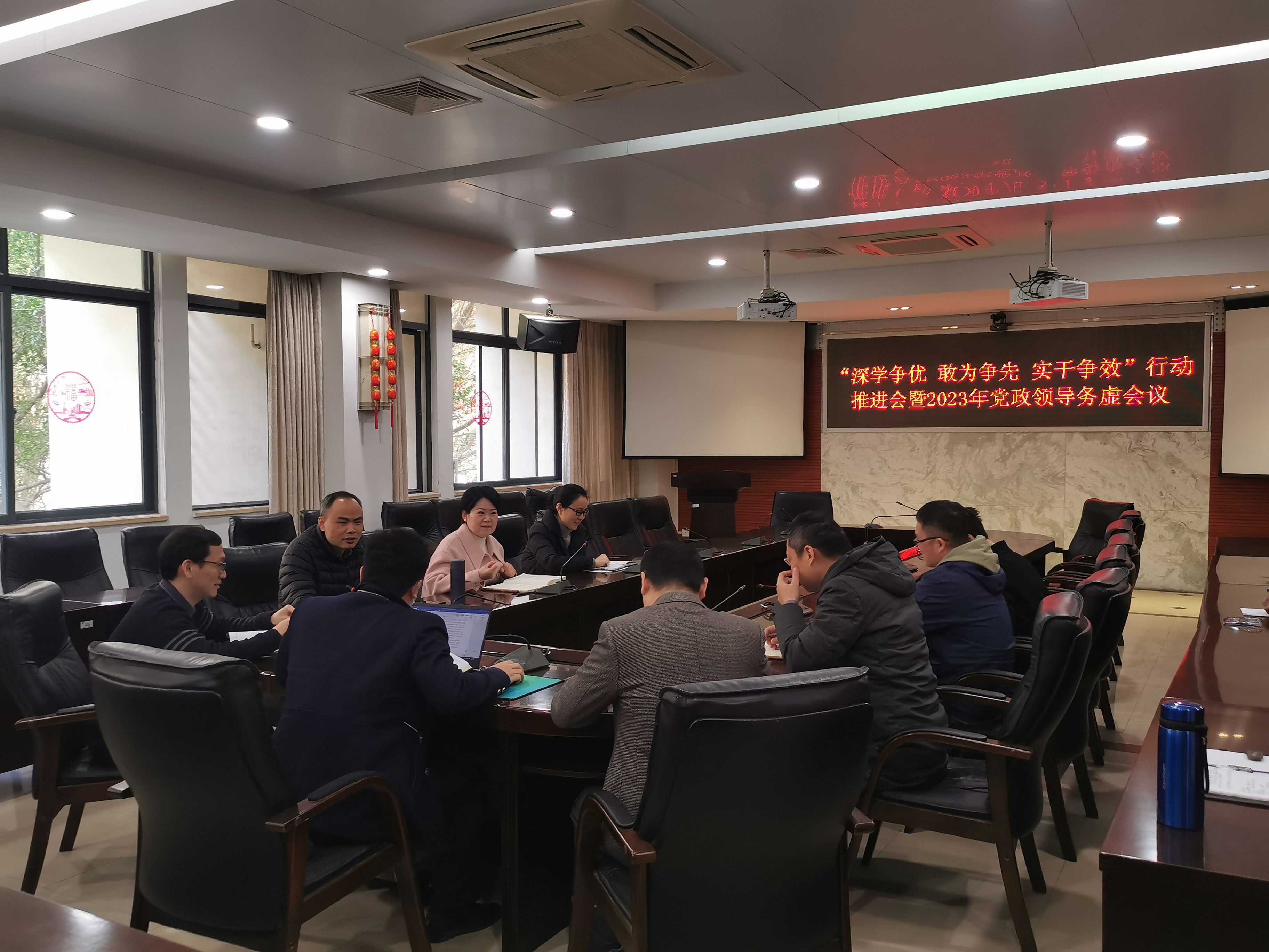 2023年2月19日下午,院党委张红书记主持召开了“深学争优、敢为争先、实干争效”行动推进会暨2023年党政领导务虚会议,学院党政班子全体成员参加了会议。