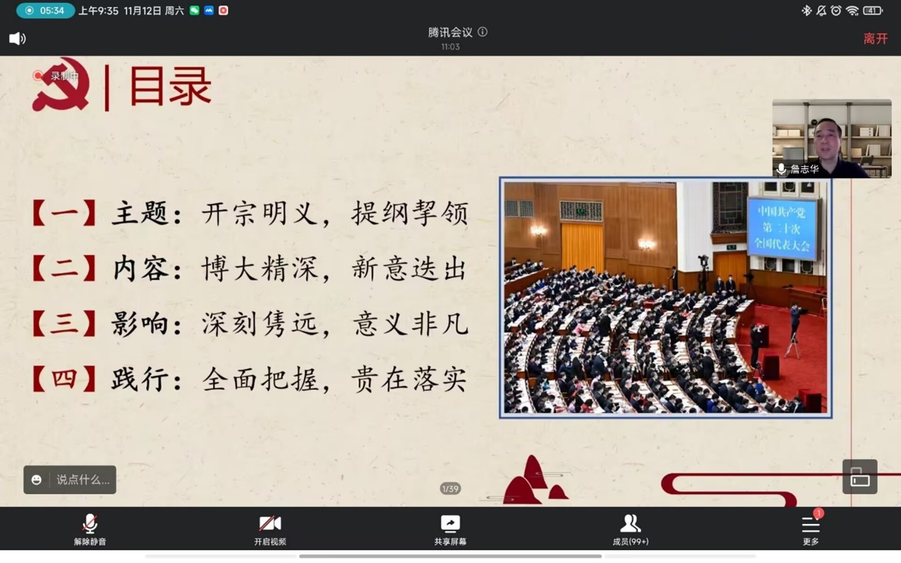 报告会上,詹志华教授以《中国化时代化的马克思主义行》为题,围绕党的二十大的主题、内容、影响、践行四个方面,深入解读党的二十大报告主题开宗明义、提纲挈领的作用及鲜明特点,内容博大精深、新意迭出,并从中国共产党史、新中国史、改革开放史、社会主义发展史、中华民族发展史五个发展史角度阐述了二十大报告的重要影响及里程碑意义,强调了学习践行二十大精神的意义,紧紧抓住时代要求、用发展的眼光把二十大精神学到深处落到实处。