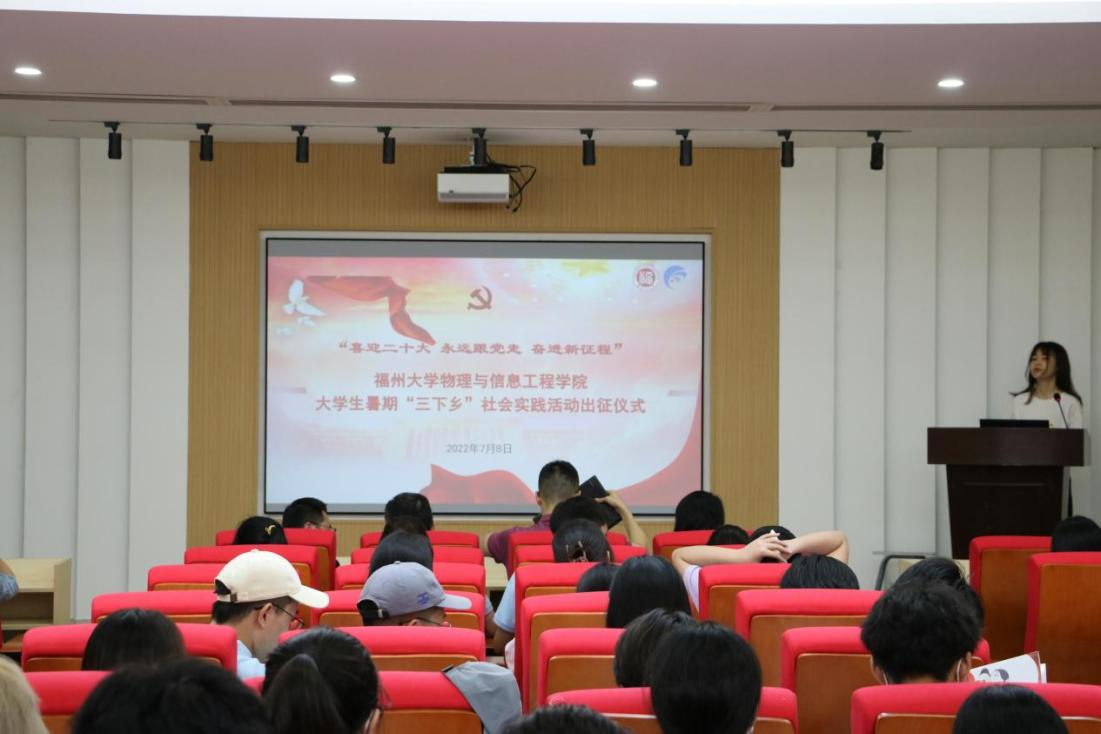 在南楼思源厅举办2022年暑期“三下乡”社会实践活动出征仪式。物信学院党委郑志刚副书记、团委书记陈山老师、团委副书记罗奕帆老师以及学工组辅导员老师出席了本次出征仪式。仪式由学院青年志愿者协会的龚紫茵同学主持。