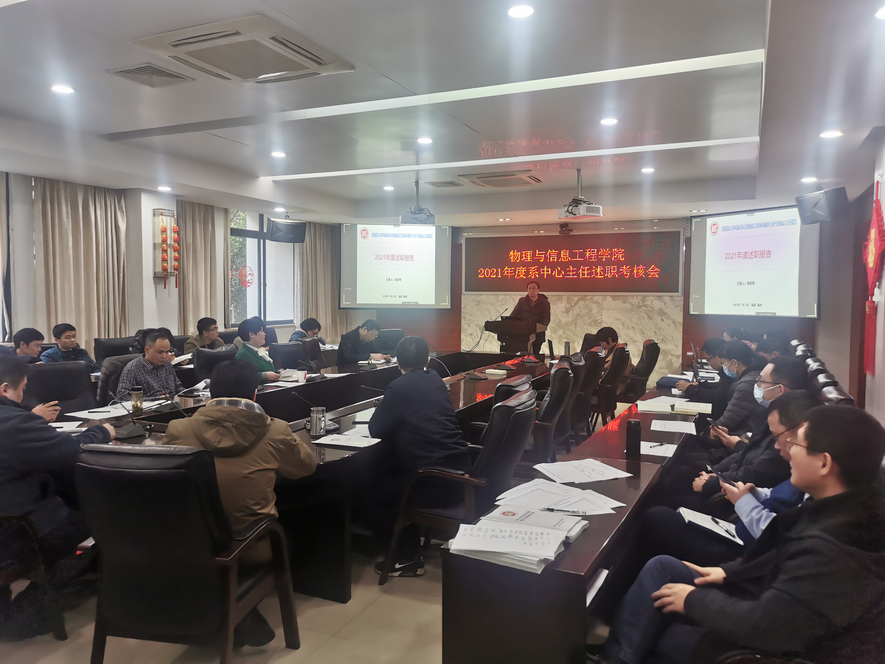 为加强学院规范化建设,增强主体意识,2022年1月4日下午,物信学院在祥联厅会议室召开2021年度系中心主任述职考评会,会议由学院党委书记张红主持,学院党政领导、系中心主任及教职工代表参加会议。