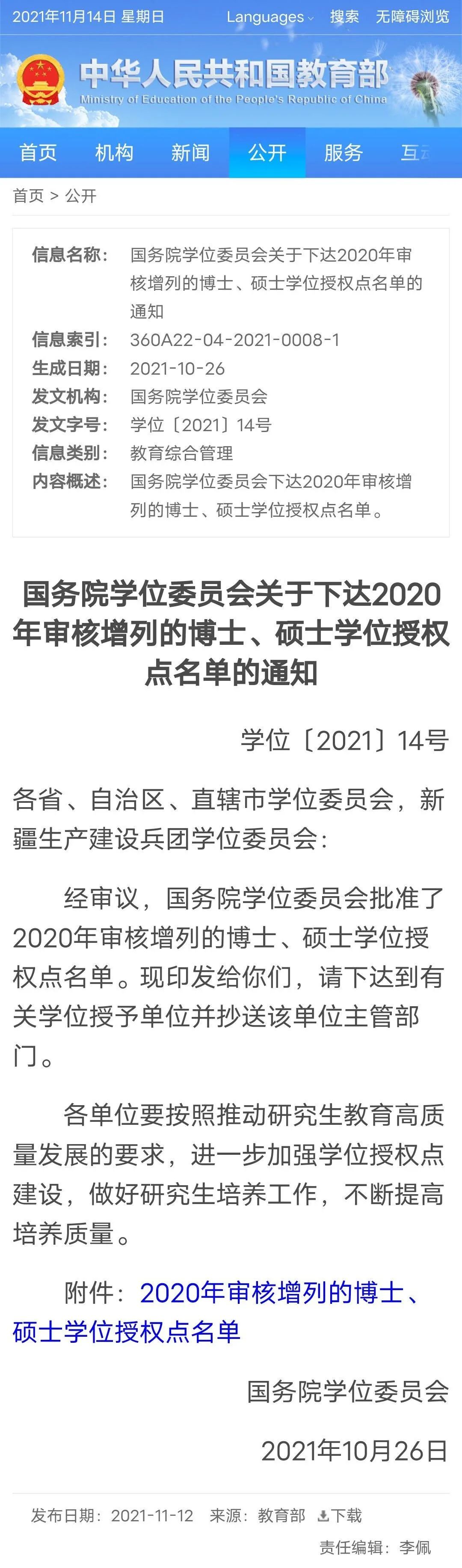 根据国务院学位委员会公布的《国务院学位委员会关于下达2020年审核增列的博士、硕士学位授权点名单的通知》,Av在线看