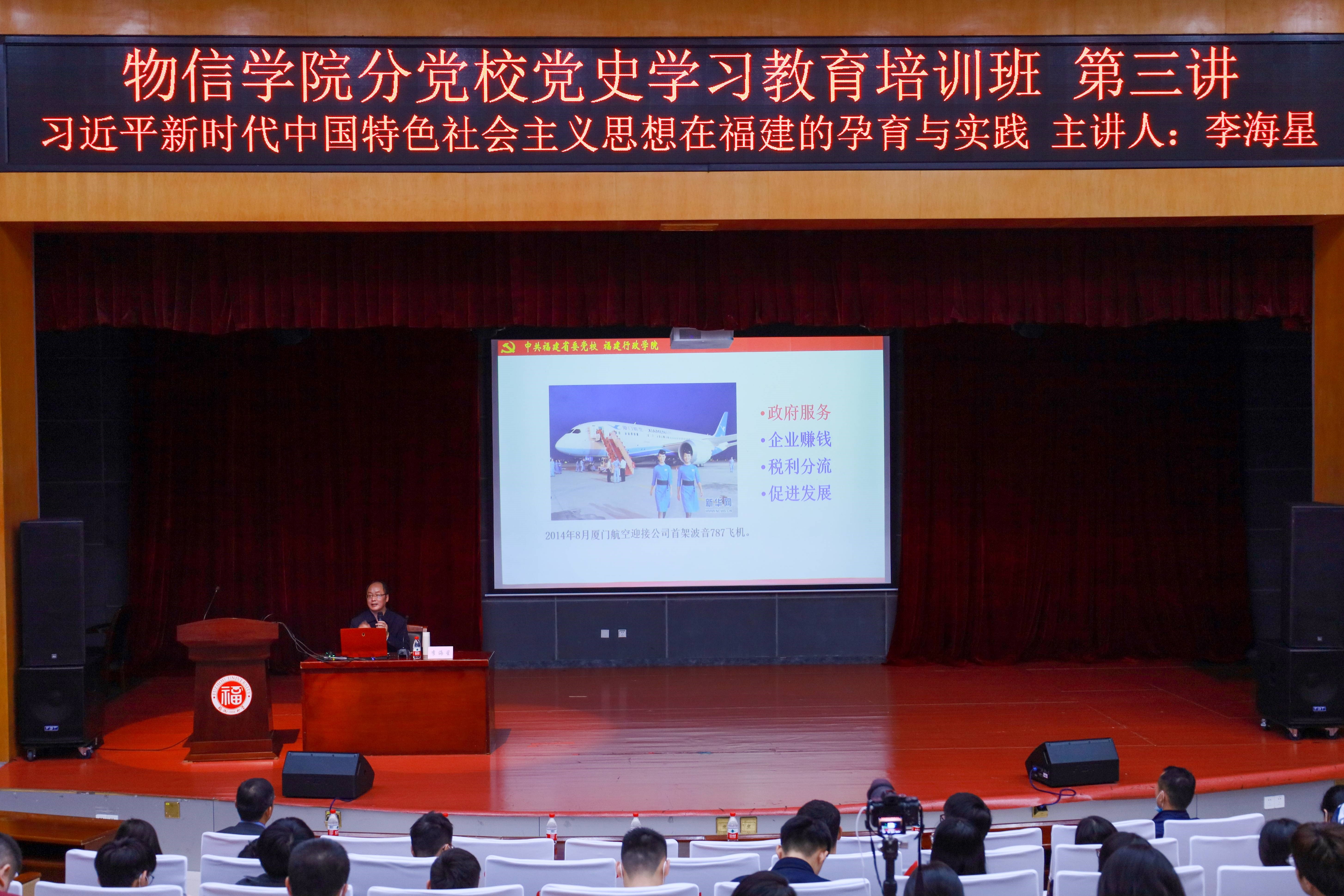 10月28日下午,物信学院党委党史学习教育培训班第3讲暨分党校第34期发展对象培训班第一讲在图书馆明德厅成功举行。本次培训班邀请福建省委党校马克思主义研究院副院长李海星教授为190名师生党员和48名发展对象作《习近平新时代中国特色社会主义思想在福建的孕育与实践》专题辅导报告。学院党委郑志刚副书记主持了报告会。