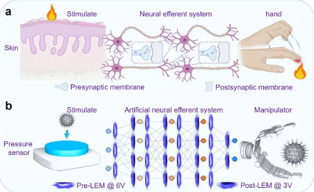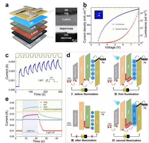 李福山教授课题组联合香港理工大学柴杨教授课题组首次报道了一种用于实现光电人工传出神经的量子点发光忆阻器(LEM)。在这项工作中,首次在单个量子点LEM 器件中结合了光接收器、光发射器和光突触的功能。量子点LEM器件中采用了新型双层电荷储存层结构,使得器件在拥有量子点发光器件高效率、高色纯等优点的同时,可以实现对外加光信号的感知和光生电荷的捕获,由此进一步调制器件的发光特性和光信号输出。本工作中,来自前LEM(突触前膜)的光信号作为后LEM(突触后膜)的输入信号,层间的信号传输完全基于器件本身光通信,无需外部光源,从而消除传统基于电子信号的神经系统中的物理限制。此外,通过模拟生物的反射弧成功构建了一个光电人工传出神经系统来智能地控制机械手。这些结果将有力推动量子点发光技术的智能化应用,并促进人工光电神经系统的构建和实现。相关研究成果以“ Light-emitting memristors for optoelectronic artificial efferent nerve ”为题发表在国际著名期刊NANO LETTERS上。该项工作的第一作者为Av在线看