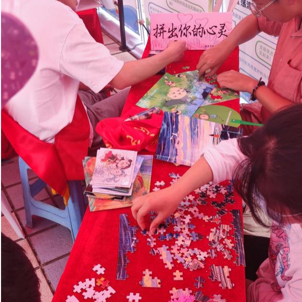 “拼出你的心灵”的多幅精美拼图吸引了同学们,在焦躁、潮湿的五月,静下心来拼图的过程,既在满足大家的游戏乐趣,也在放松大家的心灵。