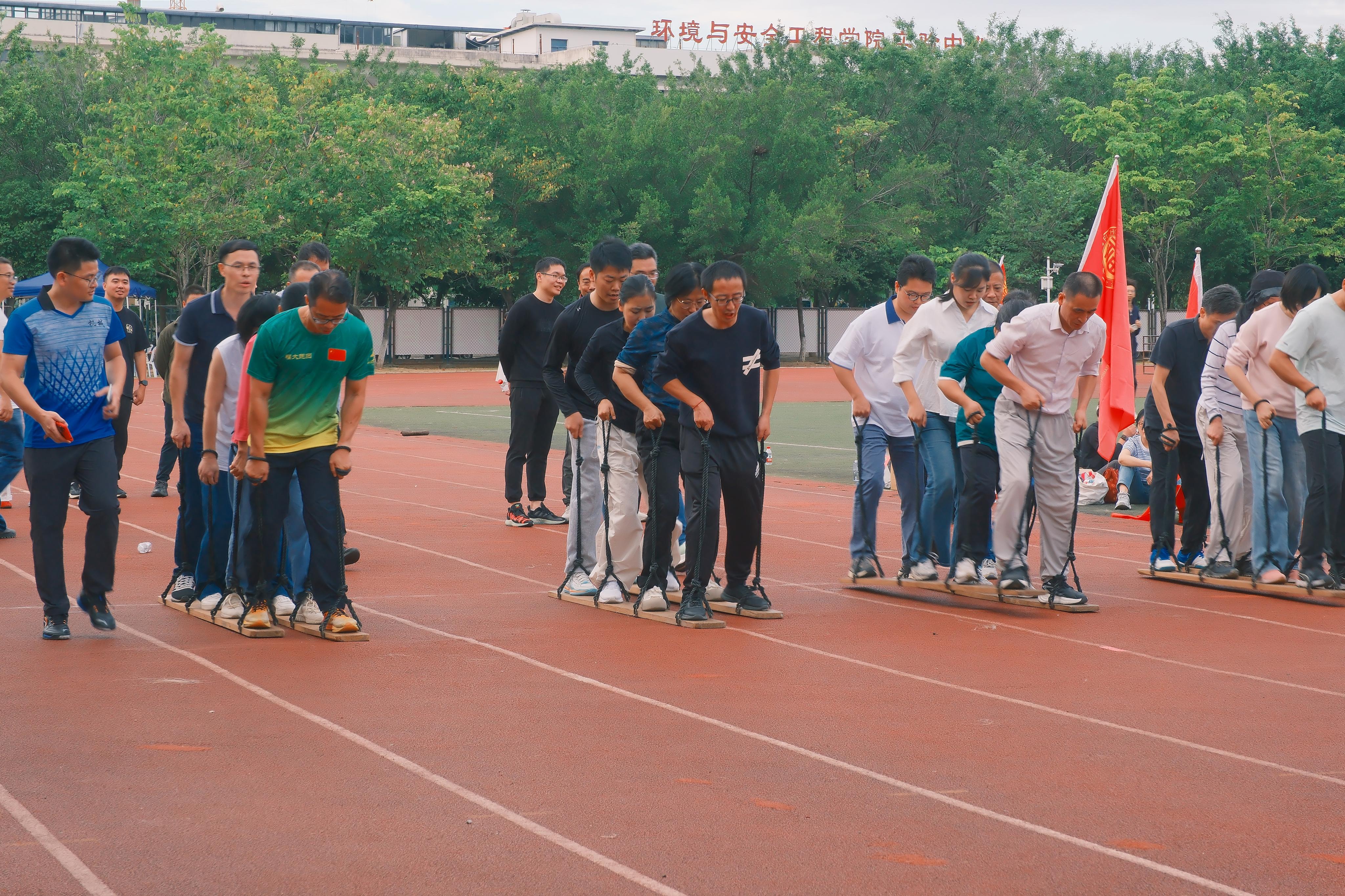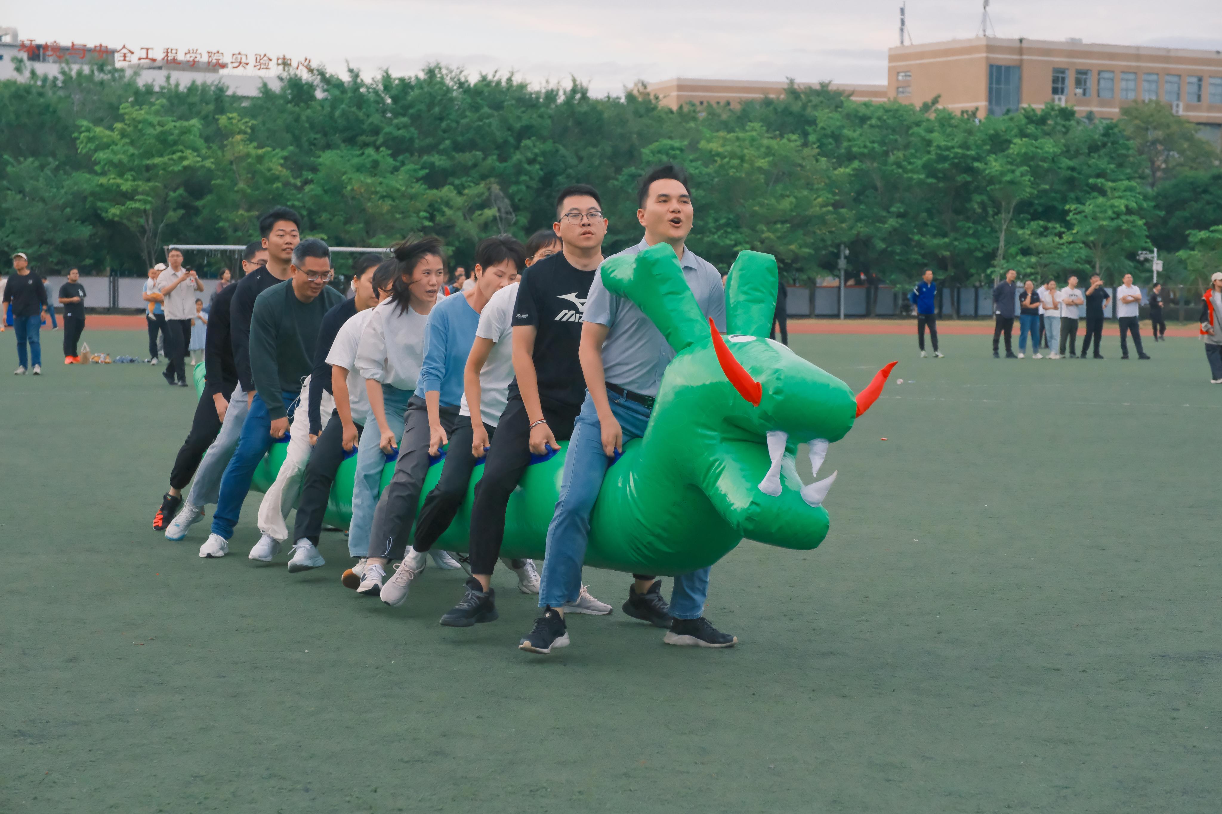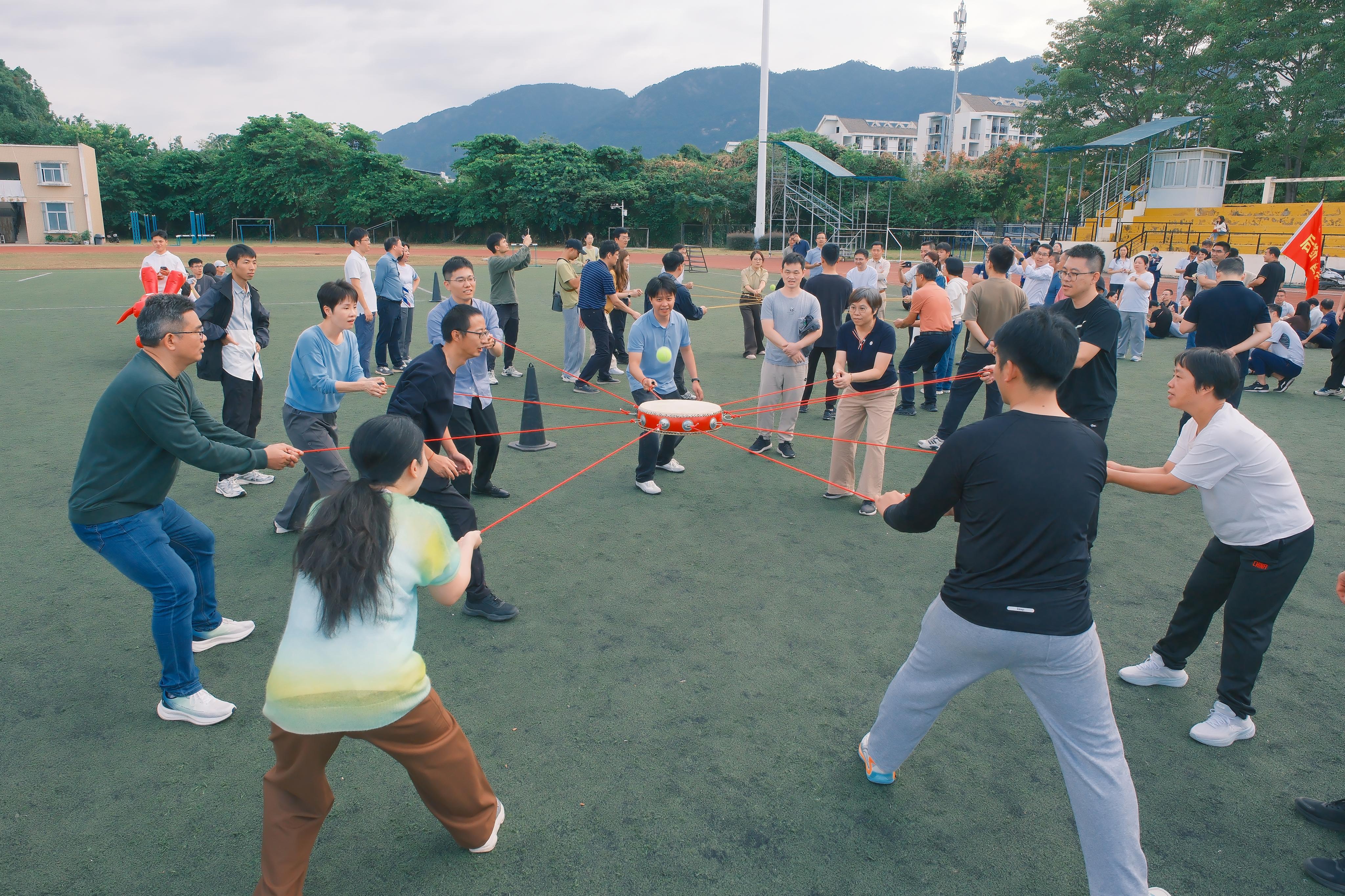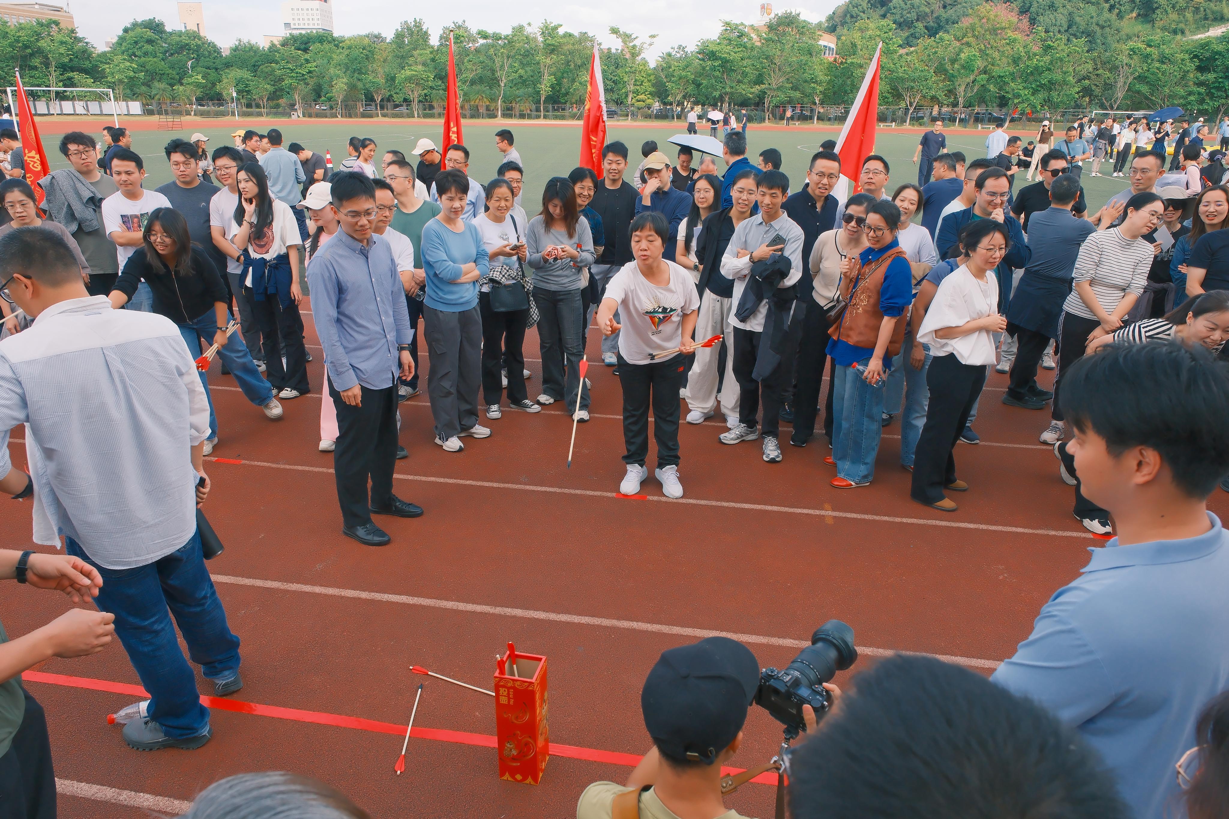 在趣味运动会中,物信学院教职工们先后参加了投壶比赛、同心击鼓、提绳踏板和龙行天下四个项目。在投壶比赛中,队员们全神贯注,精准投掷;同心击鼓项目则需要高度默契,物信学院代表队配合无间,展现了出色的团队协作能力;提绳踏板和龙行天下项目更是将现场气氛推向高潮,参赛老师们口号响亮,步调一致,赢得了现场观众的阵阵掌声。